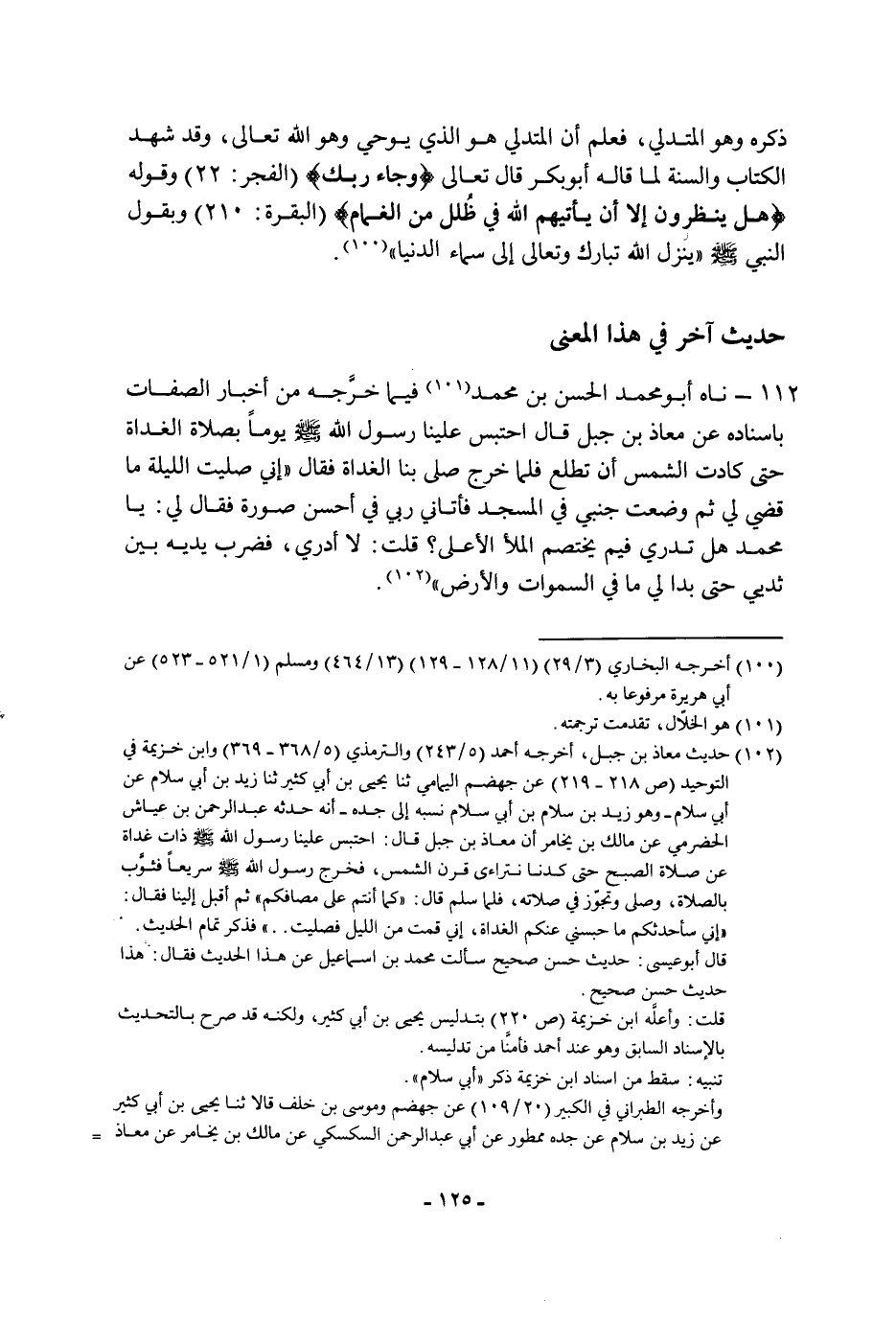 ١١٢ - ناه أَبُو مُحَمَّد الحسن بن مُحَمَّد فيما خرجه من أخبار الصفات بإسناده، عن معاذ بن جبل، قَالَ: احتبس علينا رسول الله، صَلَّى اللَّهُ عَلَيْهِ وَسَلَّمَ، يوما بصلاة الغداة حتى كادت الشمس