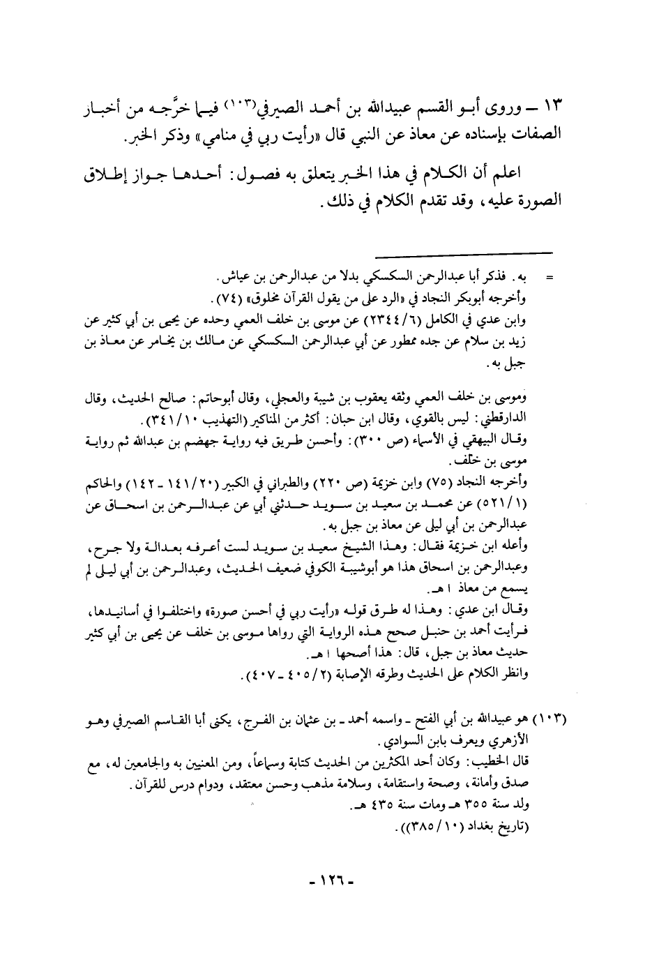 ١١٣ - وروى أَبُو القسم عبيد الله بن أَحْمَد الصيرفي فيما خرجه من أخبار الصفات بإسناده، عن معاذ، عن النبي، صَلَّى اللَّهُ عَلَيْهِ وَسَلَّمَ، قَالَ: " رأيت ربي فِي منامي " وذكر الخبر أعلم أن الكلام فِي هَذَا الخبر يتعلق به فصول: أحدها: جواز إطلاق الصورة عليه، وقد تقدم الكلام فِي ذَلِكَ