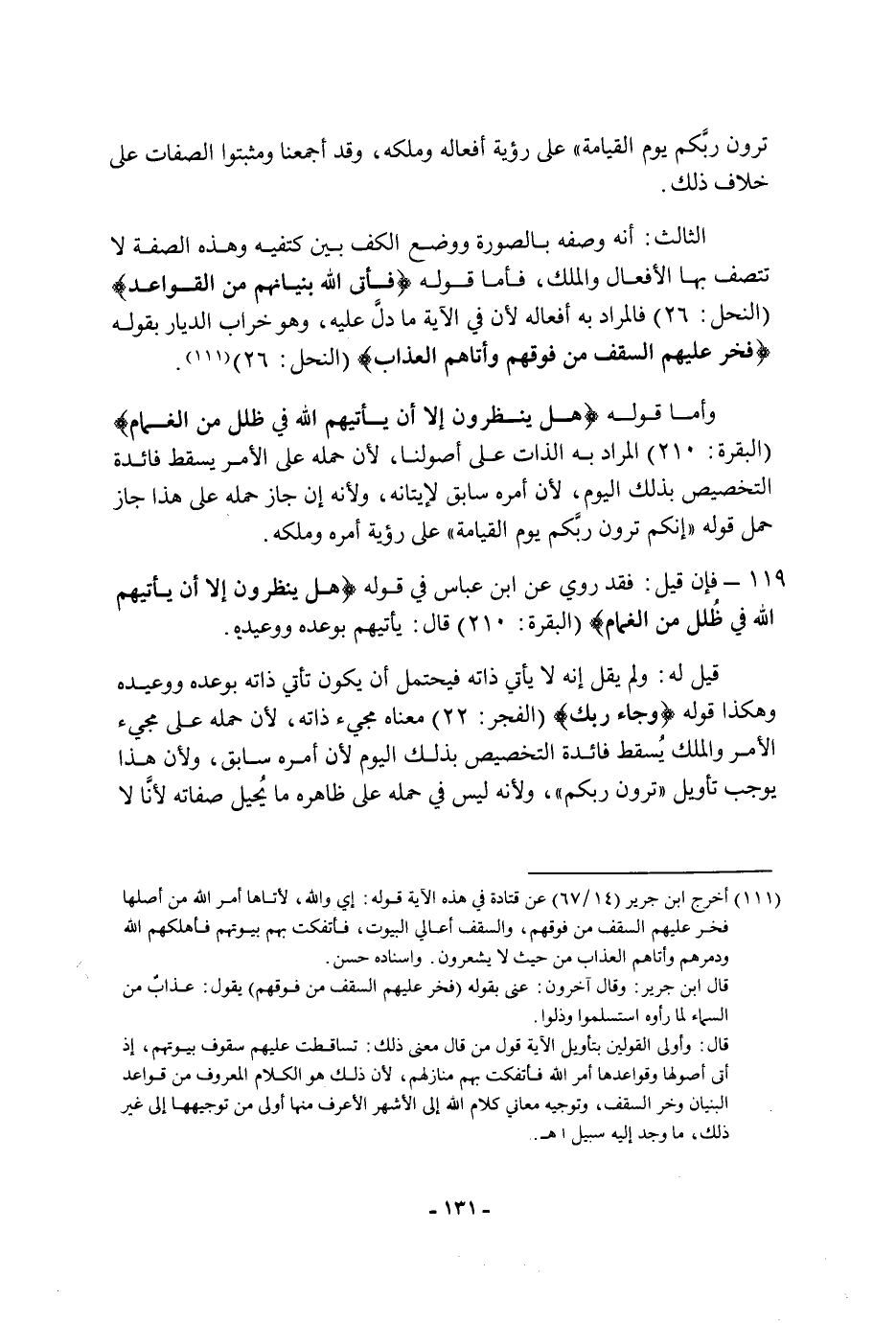 ترون ربكم يوم القيامة " عَلَى رؤية أفعاله وملكه، وقد أجمعنا ومثبتوا الصفات عَلَى خلاف ذَلِكَ الثالث: أنه وصفه بالصورة ووضع الكف بين كتفيه وهذه الصفة لا تتصف بها الأفعال والملك، فأما قوله: {فَأَتَى اللَّهُ بُنْيَانَهُمْ مِنَ الْقَوَاعِدِ} فالمراد به أفعاله لأن فِي الآية ما دل عليه، وهو خراب الديار بقوله: {فَخَرَّ عَلَيْهِمُ السَّقْفُ مِنْ فَوْقِهِمْ وَأَتَاهُمُ الْعَذَابُ} وأما قوله: {هَلْ يَنْظُرُونَ إِلا أَنْ يَأْتِيَهُمُ اللَّهُ فِي ظُلَلٍ مِنَ الْغَمَامِ} المراد به الذات عَلَى أصولنا، لأن حمله عَلَى الأمر يسقط فائدة التخصيص بذلك اليوم، لأن أمره