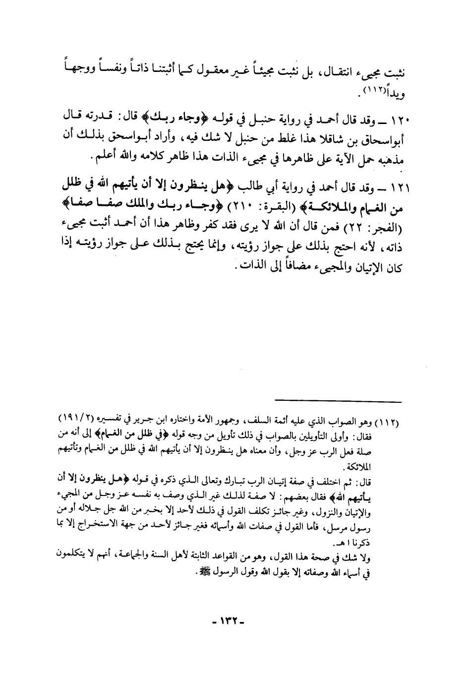 ١٢١ - وقد قَالَ أَحْمَد فِي رواية أَبِي طالب: {هَلْ يَنْظُرُونَ إِلا أَنْ يَأْتِيَهُمُ اللَّهُ فِي ظُلَلٍ مِنَ الْغَمَامِ وَالْمَلائِكَةُ} {وَجَاءَ رَبُّكَ وَالْمَلَكُ صَفًّا صَفًّا} فمن قَالَ أن الله لا يرى فقد كفر