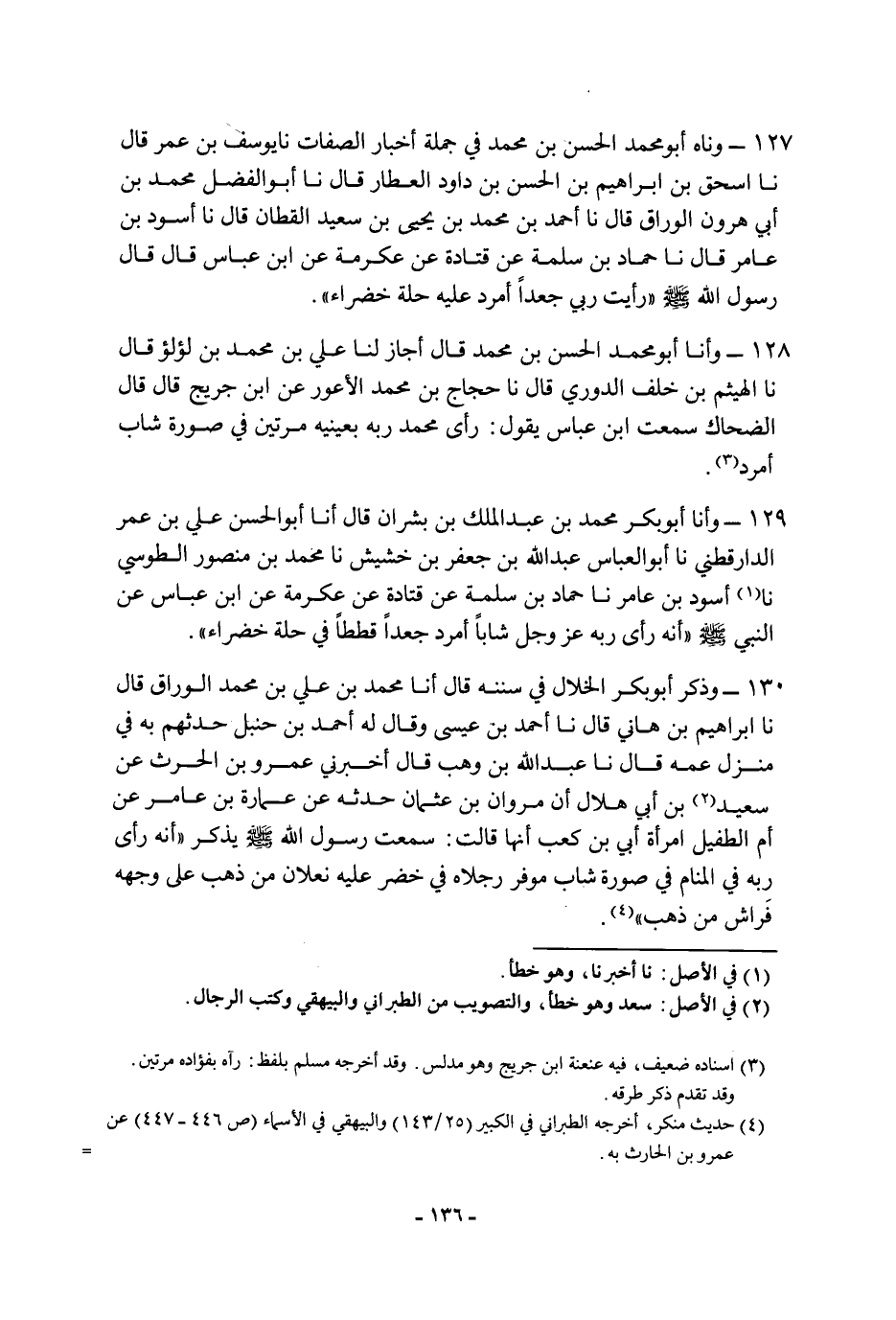 ١٢٧ - وناه أَبُو مُحَمَّدٍ الْحَسَنُ بْنُ مُحَمَّدٍ، فِي جُمْلَةِ أَخْبَارِ الصِّفَاتِ، نا يُوسُفُ بْنُ عُمَرَ، قَالَ: نا إِسْحَاقُ بْنُ إِبْرَاهِيمَ بْنِ الْحَسَنِ بْنِ دَاوُدَ الْعَطَّارُ، قَالَ: نا أَبُو الْفَضْلِ مُحَمَّدُ بْنُ أَبِي هَارُونَ الْوَرَّاقُ، قَالَ: نا أَحْمَدُ بْنُ مُحَمَّدِ بْنِ يَحْيَى بْنِ سَعِيدٍ الْقَطَّانُ، قَالَ: نا أَسْوَدُ بْنُ عَامِرٍ، قَالَ: نا حَمَّادُ بْنُ سَلَمَةَ، عَنْ قَتَادَةَ، عَنْ عِكْرِمَةَ، عَنِ ابْنِ عَبَّاسٍ، قَالَ: قَالَ رَسُولُ اللَّهِ، صَلَّى اللَّهُ عَلَيْهِ وَسَلَّمَ: " رَأَيْتُ رَبِّي جَعْدًا أَمْرَدَ عَلَيْهِ حُلَّةٌ خَضْرَاءُ "