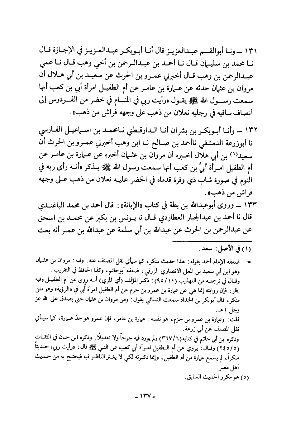 ١٣٢ - وأنا أَبُو بَكْرِ بْنُ بِشْرَانَ، أنا الدَّارَقُطْنِيُّ، نا مُحَمَّدُ بْنُ إِسْمَاعِيلَ الْفَارِسِيُّ، نا أَبُو زُرْعَةَ الدِّمَشْقِيُّ، نا أَحْمَدُ بْنُ صَالِحٍ، نا ابْنُ وَهْبٍ، أَخْبَرَنِي عَمْرُو بْنُ الْحَارِثِ، أَنَّ سَعِيدَ بْنَ أَبِي هِلالٍ أَخْبَرَهُ، أَنَّ مَرْوَانَ بْنَ عُثْمَانَ أَخْبَرَهُ، عَنْ عُمَارَةَ بْنِ عَامِرٍ، عَنْ أُمِّ الطُّفَيْلِ، امْرَأَةِ أُبَيِّ بْنِ كَعْبٍ، أَنَّهَا سَمِعَتْ رَسُولَ اللَّهِ، صَلَّى اللَّهُ عَلَيْهِ وَسَلَّمَ، يَذْكُرُ: " أَنَّهُ رَأَى رَبَّهُ فِي النَّوْمِ فِي صُورَةِ شَابٍّ ذِي وَفْرَةٍ، قَدَمَاهُ فِي الْخُضْرِ، عَلَيْهِ نَعْلانِ مِنْ ذَهَبٍ، عَلَى وَجْهِهِ فَرَاشٌ مِنْ ذَهَبٍ "