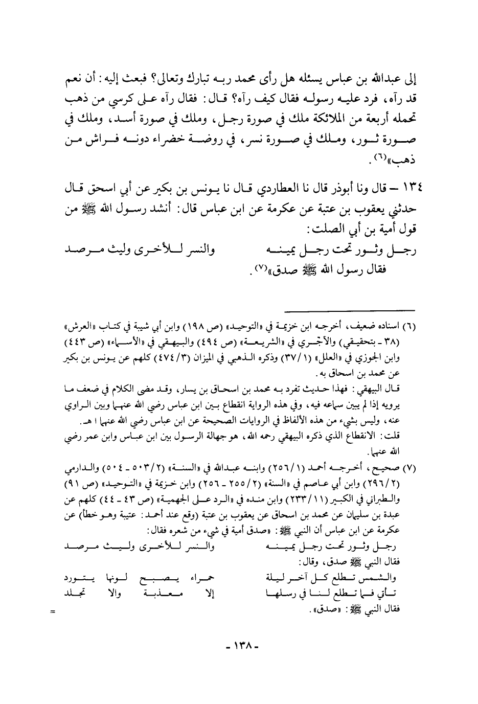 ١٣٤ - وَقَالَ: ونا أَبُو ذر، قَالَ: نا العطاردي، قَالَ: نا يونس بن بكير، عن أَبِي إسحاق، قَالَ: حَدَّثَنِي يعقوب بن عتبة، عن عكرمة، عن ابن عباس، قَالَ: أنشد رسول الله، صَلَّى اللَّهُ عَلَيْهِ وَسَلَّمَ، من قول أمية بن أَبِي الصلت: