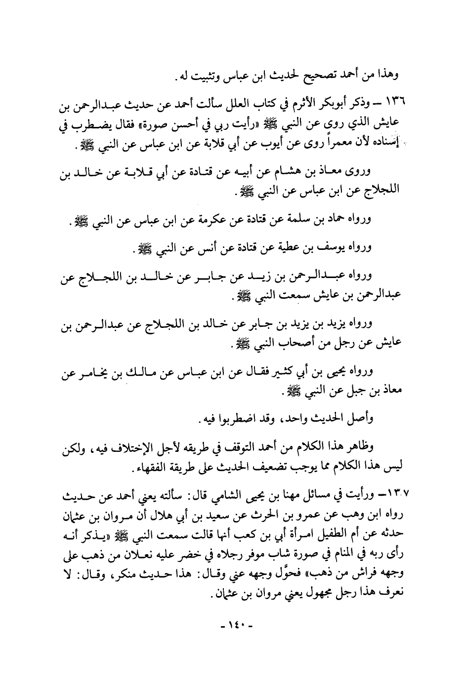 ١٣٦ - وذكر أَبُو بكر الأثرم فِي كتاب العلل: سألت أَحْمَد عن حديث عبد الرحمن بن عايش الذي روى عن النبي، صَلَّى اللَّهُ عَلَيْهِ وَسَلَّمَ: " رأيت ربي فِي أحسن صورة " فقال: يضطرب فِي إسناده لأن معمرا روى عن أيوب، عن أَبِي قلابة، عن ابن عباس، عن النبي، صَلَّى اللَّهُ عَلَيْهِ وَسَلَّمَ وروى معاذ بن هشام، عن أبيه، عن قتادة، عن أَبِي قلابة، عن خالد بن اللجلاج، عن ابن عباس، عن النبي، صَلَّى اللَّهُ عَلَيْهِ وَسَلَّمَ ورواه حَمَّاد بن سلمة، عن قتادة، عن عكرمة، عن ابن عباس، عن النبي، صَلَّى اللَّهُ عَلَيْهِ وَسَلَّمَ ورواه يُوسُف بن عطية، عن قتادة، عن أنس