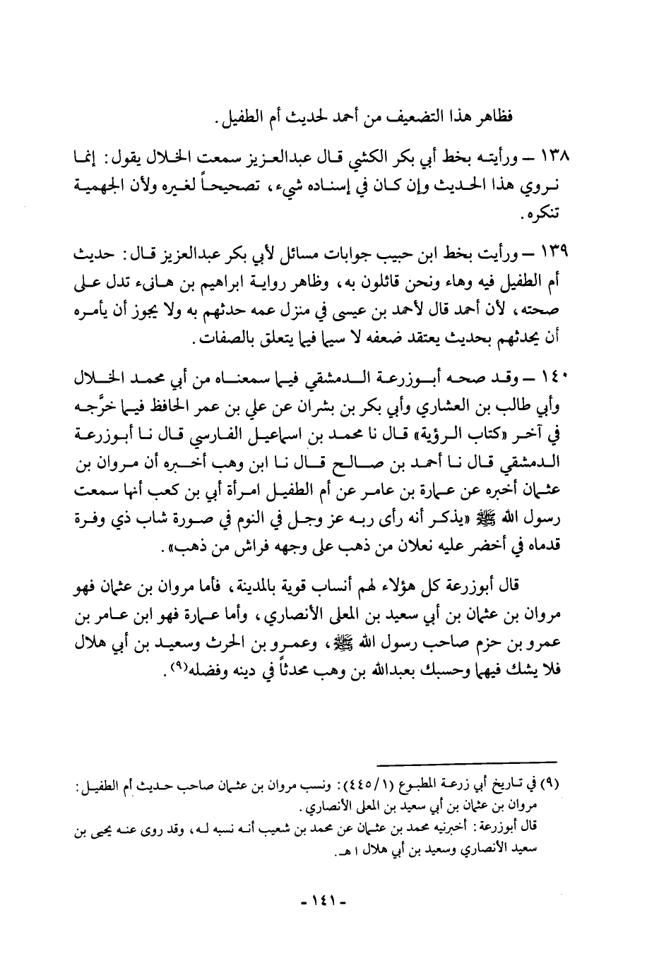 ١٣٩ - ورأيت بخط ابن حبيب جوابات مسائل لأبي بكر عبد العزيز، قَالَ: حديث أم الطفيل فيه وهاء ونحن قائلون به، وظاهر رواية إبراهيم بن هانئ تدل عَلَى صحته، لأن أَحْمَد قَالَ لأحمد بن عيسى فِي منزل عمه حدثهم به، ولا يجوز أن يأمره أن يحدثهم بحديث يعتقد ضعفه لا سيما فيما يتعلق بالصفات