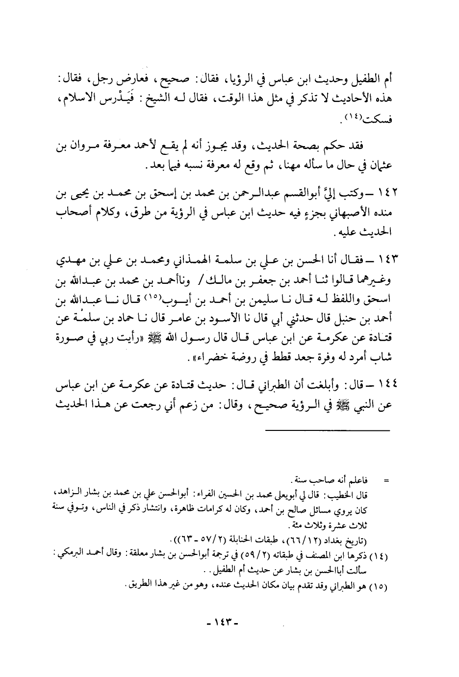 ١٤٤ - قَالَ: وَأُبْلِغْتُ أَنَّ الطَّبَرَانِيَّ، قَالَ: حَدِيثُ قَتَادَةَ، عَنْ عِكْرِمَةَ، عَنِ ابْنِ عَبَّاسٍ، عَنِ النَّبِيِّ، صَلَّى اللَّهُ عَلَيْهِ وَسَلَّمَ، فِي الرُّؤْيَةِ صَحِيحٌ، وَقَالَ: مَنْ زَعَمَ أَنِّي رَجَعْتُ عَنْ هَذَا الْحَدِيثِ