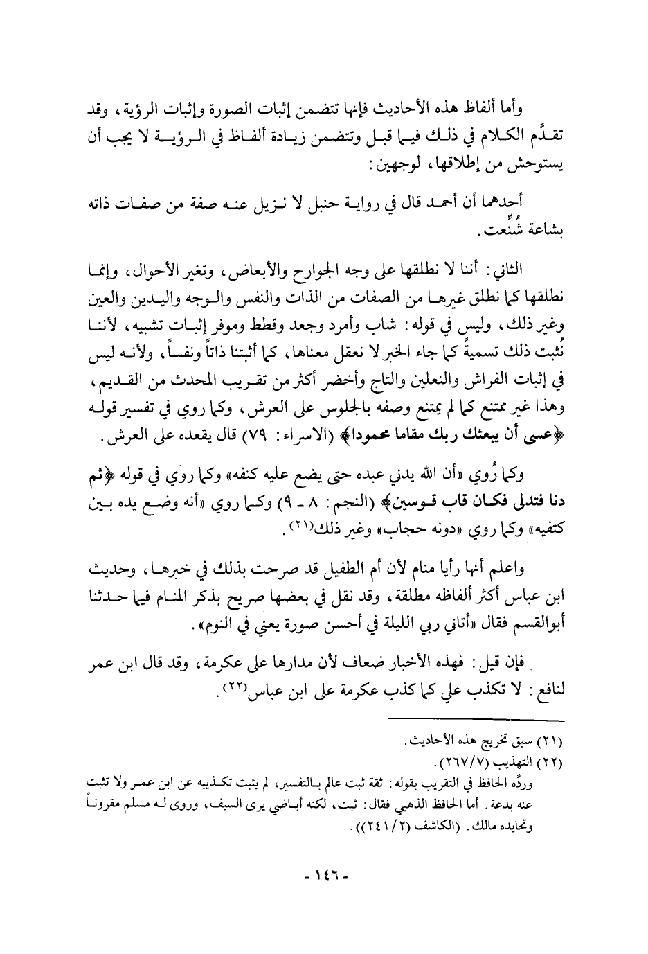 وأما ألفاظ هَذِهِ الأحاديث فأنها تتضمن إثبات الصورة وإثبات الرؤية، وقد تقدم الكلام فِي ذَلِكَ فيما قبل وتتضمن زيادة ألفاظ فِي الرؤية لا يجب أن يستوحش من إطلاقها، لوجهين: أحدهما: أن أَحْمَد قَالَ فِي رواية حنبل: لا نزيل عنه صفة من صفات ذاته بشاعة شنعت الثاني: أننا لا نطلقها عَلَى وجه الجوارح والأبعاض، وتغير الأحوال، وإنما نطلقها كما نطلق غيرها من الصفات من الذات والنفس والوجه واليدين والعين وغير ذَلِكَ، وليس فِي قوله: شاب وأمرد وجعد وقطط وموفر إثبات تشبيه،