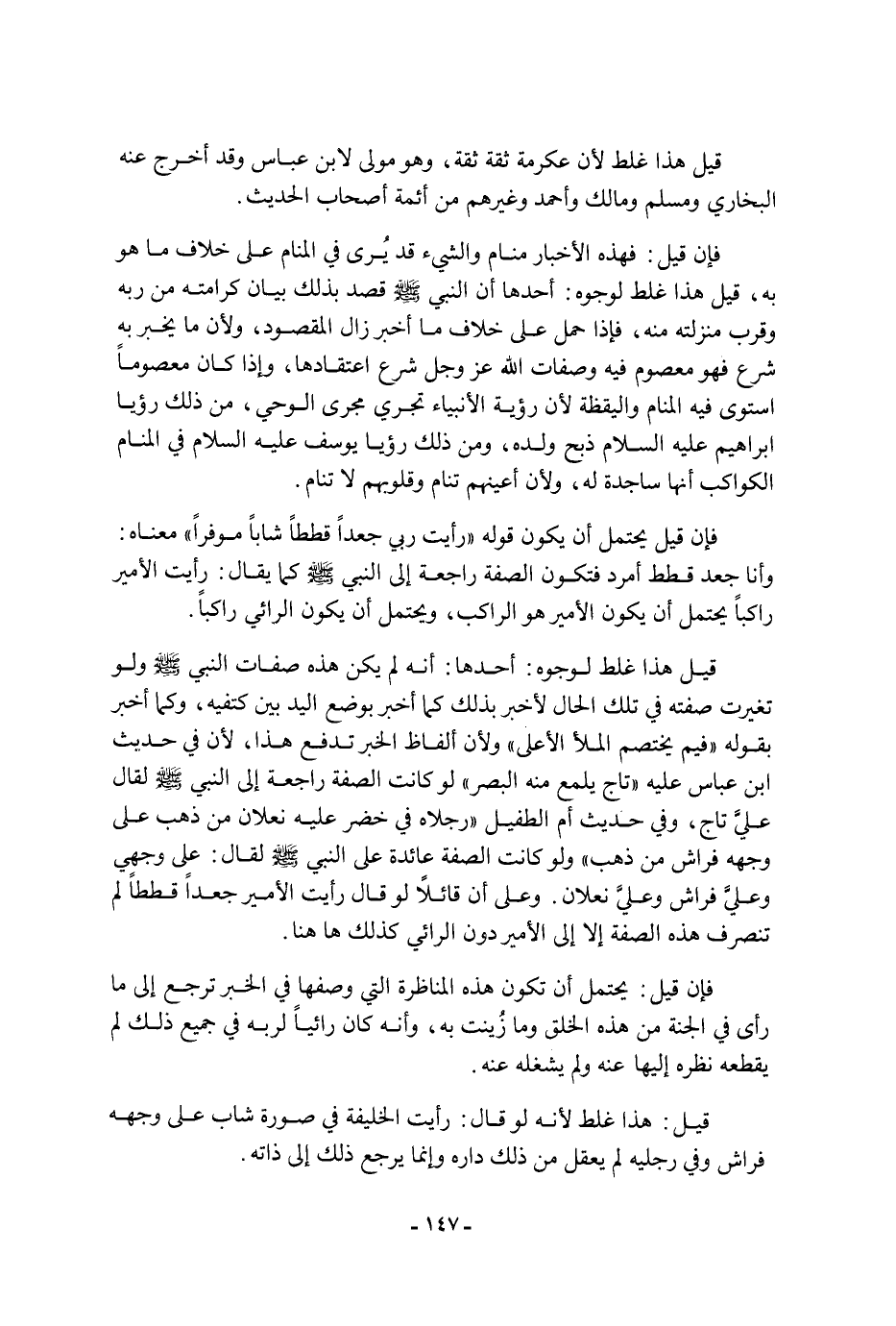 هَذَا غلط لوجوه: أحدها: أن النبي، صَلَّى اللَّهُ عَلَيْهِ وَسَلَّمَ، قصد بذلك بيان كرامته من ربه وقرب منزلته منه، فإذا حمل عَلَى خلاف ما أخبر زال المقصود، ولأن ما يخبر به شرع فهو معصوم فيه وصفات الله، عَزَّ وَجَلَّ، شرع اعتقادها، وإذا كان معصوما استوى فيه المنام واليقظة لأن رؤية الأنبياء تجري مجرى الوحي، من ذَلِكَ رؤيا إبراهيم، عَلَيْهِ السَّلامُ، ذبح ولده، ومن ذَلِكَ رؤيا يُوسُف، عَلَيْهِ السَّلامُ، فِي المنام الكواكب أنها ساجدة له، ولأن أعينهم تنام وقلوبهم لا تنام فإن قيل: يحتمل أن يكون قوله: " رأيت ربي جعدا قططا شابا موفرا " معناه: وأنا جعد قطط أمرد فتكون الصفة راجعة إلى النبي، صَلَّى اللَّهُ عَلَيْهِ وَسَلَّمَ، كما يقال: رأيت الأمير راكبا يحتمل أن يكون الأمير هو الراكب، ويحتمل أن يكون الرائي راكبا قيل: هَذَا غلط لوجوه: أحدها: أنه لم يكن هَذِهِ صفات النبي، صَلَّى اللَّهُ عَلَيْهِ وَسَلَّمَ، ولو تغيرت صفته فِي تِلْكَ الحال لأخبر بذلك كما أخبر بوضع اليد بين كتفيه، وكما أخبر بقوله: " فيم يختصم الملأ الأعلى " ولأن ألفاظ الخبر تدفع هَذَا، لأن فِي حديث ابن عباس: " عليه تاج يلمع منه البصر " لو كانت الصفة راجعة إلى النبي، صَلَّى اللَّهُ