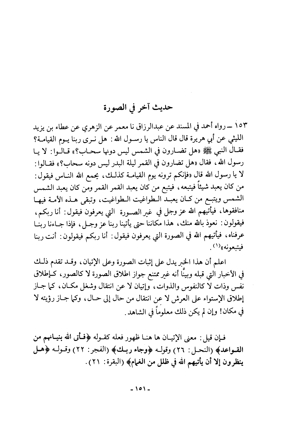١٥٣ - رواه أَحْمَد فِي المسند عن عبد الرزاق، نا معمر، عن الزهري، عن عطاء بن يزيد الليثي، عن أَبِي هُرَيْرَةَ، قَالَ: قَالَ الناس: يا رسول الله: هل نرى ربنا يوم القيامة؟ فقال النبي، صَلَّى اللَّهُ عَلَيْهِ وَسَلَّمَ: " هل تضارون فِي الشمس ليس دونها سحاب؟ " قَالُوا: لا يا رسول الله، فقال: " هل تضارون فِي القمر ليلة البدر ليس دونه سحاب؟ " فقالوا: لا يا رسول الله، قَالَ: " فإنكم ترونه يوم القيامة كذلك، يجمع الله الناس فيقول: من كان يعبد شيئا قيتبعه، فيتبع من كان يعبد القمر القمر، ومن كان يعبد الشمس الشمس، ويتبع من كان يعبد الطواغيت الطواغيت، وتبقى هَذِهِ الأمة فيها منافقوها، فيأتيهم الله، عَزَّ وَجَلَّ، فِي غير الصورة التي يعرفون فيقول: أنا ربكم، فيقولون: نعوذ بالله منك، هَذَا مكاننا حتى يأتينا ربنا، عَزَّ وَجَلَّ، فإذا جاءنا ربنا عرفناه، فيأتيهم الله فِي الصورة التي