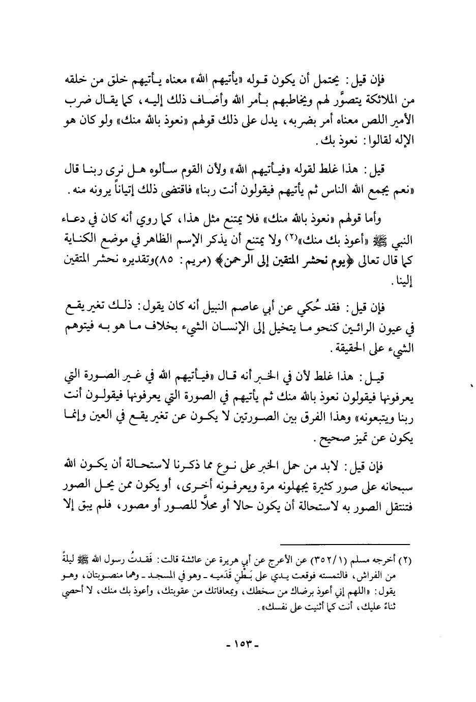 الإله لقالوا: نعوذ بك قيل: هَذَا غلط لقوله: " فيأتيهم الله " ولأن القوم سألوه هل نرى ربنا؟ قَالَ: " نعم يجمع الله الناس ثم يأتيهم فيقولون: أنت ربنا " فاقتضى ذَلِكَ إتيانا يرونه منه وأما قولهم: " نعوذ بالله منك " فلا يمتنع مثل هَذَا، كما روي أنه كان فِي دعاء النبي، صَلَّى اللَّهُ عَلَيْهِ وَسَلَّمَ: " أعوذ بك منك " ولا يمتنع أن يذكر الاسم الظاهر فِي موضع الكناية كما قَالَ تَعَالَى: {يَوْمَ نَحْشُرُ الْمُتَّقِينَ إِلَى الرَّحْمَنِ} وتقديره نحشر المتقين إلينا فإن قيل: فقد حكي عن أَبِي عاصم النبيل أنه كان يَقُول: ذَلِكَ تغير يقع فِي عيون الرائين كنحو ما يتخيل إلى الإنسان الشيء بخلاف ما هو به فيتوهم الشيء عَلَى الحقيقة قيل: هَذَا غلط لأن فِي الخبر أنه قَالَ: " فيأتيهم الله فِي غير الصورة التي يعرفونها فيقولون: نعوذ بالله منك، ثم يأتيهم فِي الصورة التي يعرفونها فيقولون: أنت ربنا ويتبعونه " وهذا الفرق بين الصورتين لا يكون عن تغير يقع فِي العين وإنما يكون عن تميز صحيح فإن قيل: لا بد من حمل الخبر عَلَى نوع مما ذكرنا لاستحالة أن يكون الله سُبْحَانَهُ عَلَى صور كثيرة يجهلونه مرة ويعرفونه أخرى، أو يكون ممن يحل الصور فتنتقل الصور به لاستحالة أن يكون حالا أو