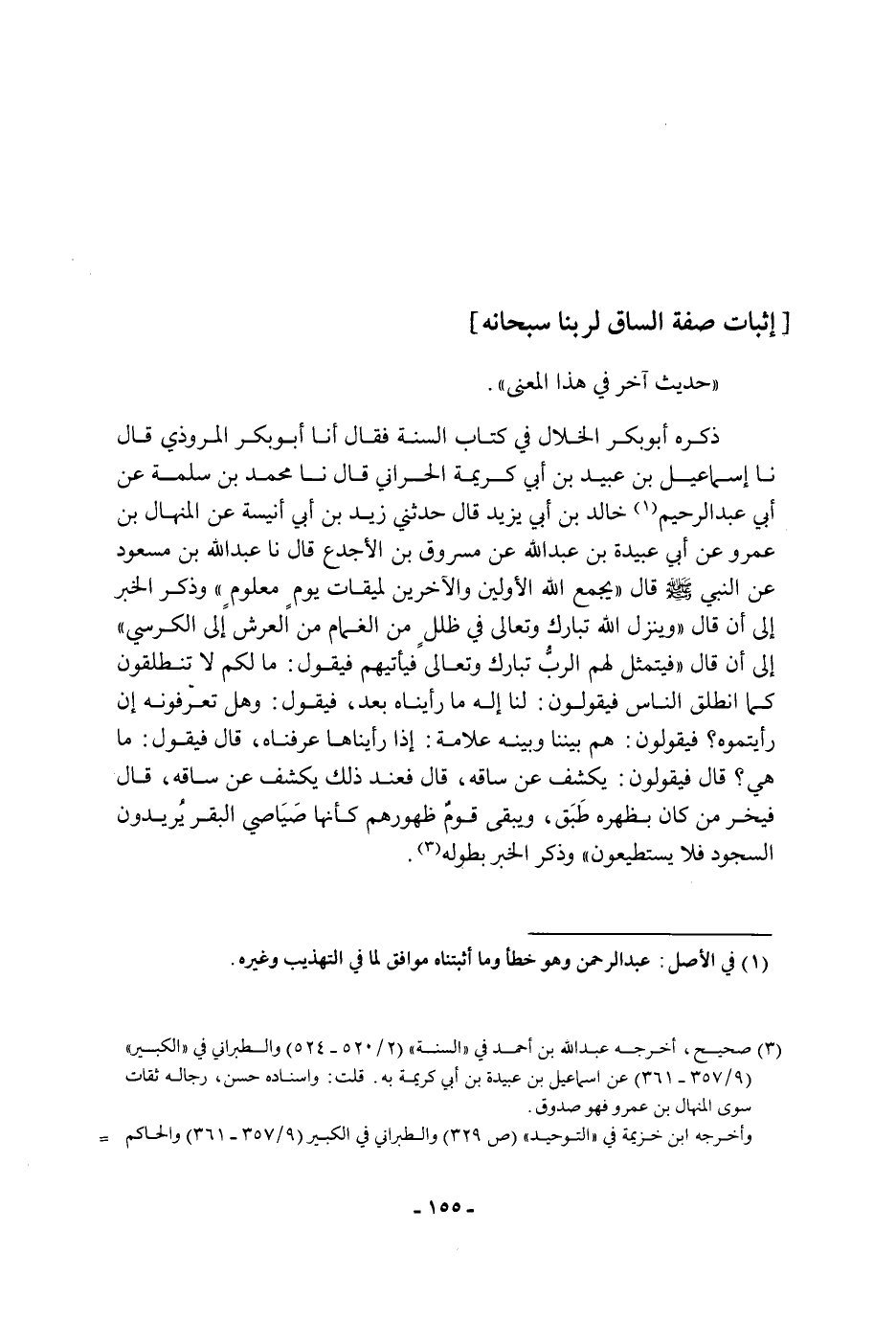 ذَكَرَهُ أَبُو بَكْرٍ الْخَلالُ فِي كِتَابِ السُّنَّةِ، فَقَالَ: أنا أَبُو بَكْرٍ الْمَرُّوذِيُّ، قَالَ: نا إِسْمَاعِيلُ بْنُ عُبَيْدِ بْنِ أَبِي كَرِيمَةَ الْحَرَّانِيُّ، قَالَ: نا مُحَمَّدُ بْنُ سَلَمَةَ، عَنْ أَبِي عَبْدِ الرَّحِيمِ خَالِدِ بْنِ أَبِي يَزِيدَ، قَالَ: حَدَّثَنِي زَيْدُ بْنُ أَبِي أُنَيْسَةَ، عَنِ الْمِنْهَالِ بْنِ عَمْرٍو، عَنْ أَبِي عُبَيْدَةَ بْنِ عَبْدِ اللَّهِ، عَنْ مَسْرُوقِ بْنِ الأَجْدَعِ، قَالَ: نا عَبْدُ اللَّهِ بْنُ مَسْعُودٍ، عَنِ النَّبِيِّ، صَلَّى اللَّهُ عَلَيْهِ وَسَلَّمَ، قَالَ: " يَجْمَعُ اللَّهُ الأَوَّلِينَ وَالآخِرِينَ لِمِيقَاتِ يَوْمٍ مَعْلُومٍ " وَذَكَرَ الْخَبَرَ إِلَى أَنْ قَالَ: " وَيَنْزِلُ اللَّهُ، تَبَارَكَ وَتَعَالَى، فِي ظُلَلٍ مِنَ الْغَمَامِ مِنَ الْعَرْشِ إِلَى الْكُرْسِيِّ " إِلَى أَنْ قَالَ: " فَيَتَمَثَّلُ لَهُمُ الرَّبُّ، تَبَارَكَ وَتَعَالَى، فَيَأْتِيهِمْ فَيَقُولُ: مَا لَكُمْ لا تَنْطَلِقُونَ كَمَا انْطَلَقَ النَّاسُ؟ فَيَقُولُونَ: لَنَا إِلَهٌ مَا رَأَيْنَاهُ بَعْدُ، فَيَقُولُ: وَهَلْ تَعْرِفُونَهُ إِنْ رَأَيْتُمُوهُ؟ فَيَقُولُونَ: إِنَّ بَيْنَنَا وَبَيْنَهُ عَلامَةً، إِذَا رَأَيْنَاهَا عَرَفْنَاهُ، قَالَ: فَيَقُولُ: مَا هِيَ؟ قَالَ: فَيَقُولُونَ: يُكْشَفُ عَنْ سَاقِهِ، قَالَ: فَعِنْدَ ذَلِكَ يُكْشَفُ عَنْ سَاقِهِ، قَالَ: فَيَخِرُّ مَنْ كَانَ بِظَهْرِهِ طَبَقٌ، وَيَبْقَى قَوْمٌ ظُهُورُهُمْ كَأَنَّهَا صَيَاصِي الْبَقَرِ يُرِيدُونَ السُّجُودَ فَلا يَسْتَطِيعُونَ " وَذَكَرَ الْخَبَرَ بِطُولِهِ