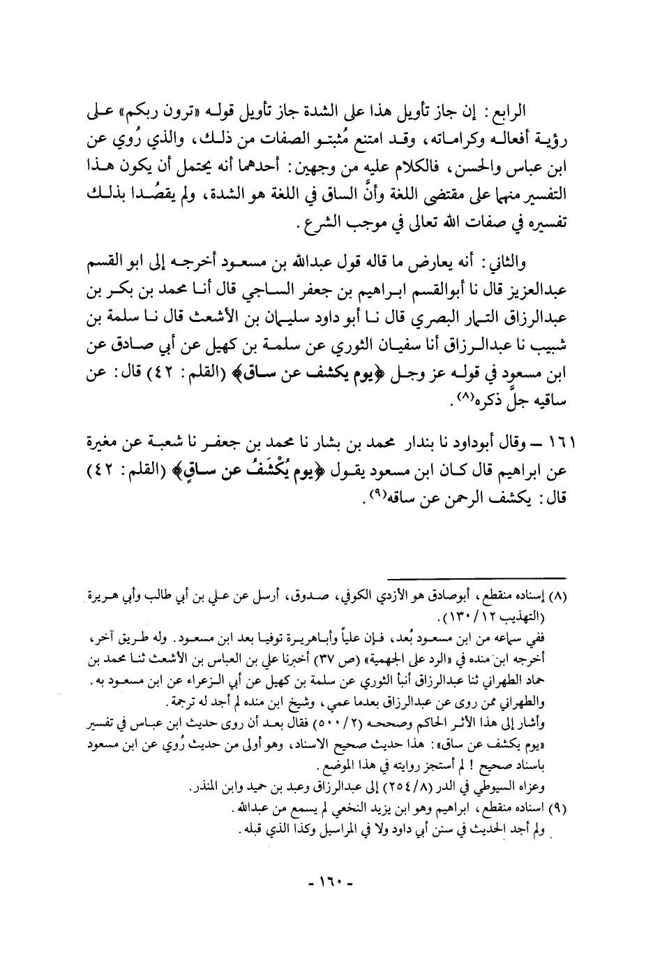 ١٦١ - وَقَالَ أَبُو داود: نا بندار مُحَمَّد بن بشار، نا مُحَمَّد بن جعفر، نا شعبة، عن مغيرة، عن إبراهيم، قَالَ: كان ابن مسعود يَقُول: {يَوْمَ يُكْشَفُ عَنْ سَاقٍ} قَالَ: يكشف الرحمن عن ساقه