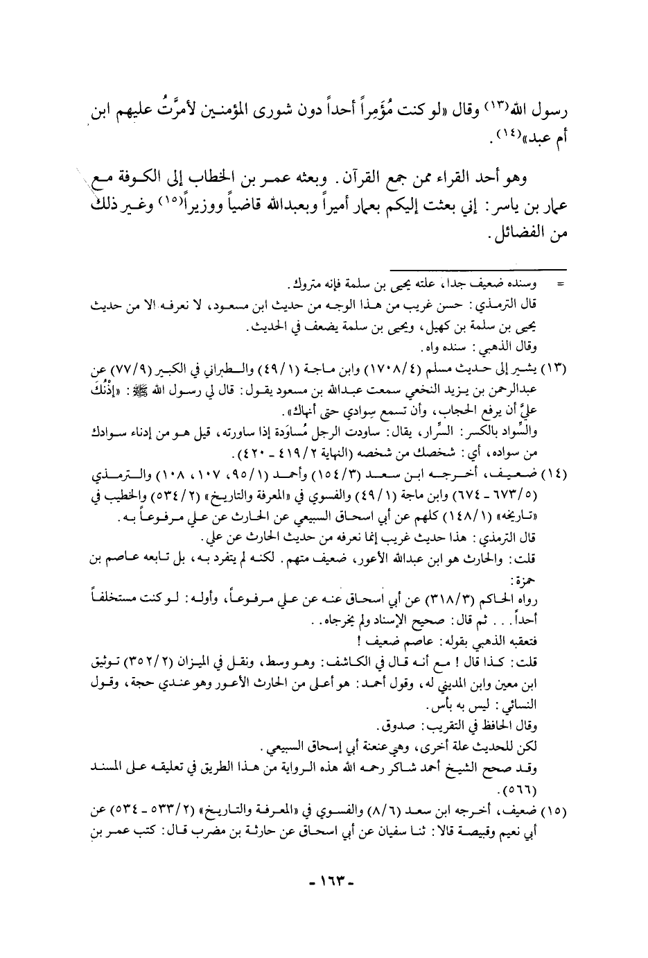 رسول الله وَقَالَ: " لو كنت مؤمرا أحدا دون شورى المؤمنين لأمرت عليهم ابن أم عبد " وهو أحد القراء ممن جمع القرآن وبعثه عمر بن الخطاب إلى الكوفة مع عمار بن ياسر: إني بعثت إليكم بعمار أميرا وبعبد الله قاضيا ووزيرا، وغير ذَلِكَ من الفضائل.