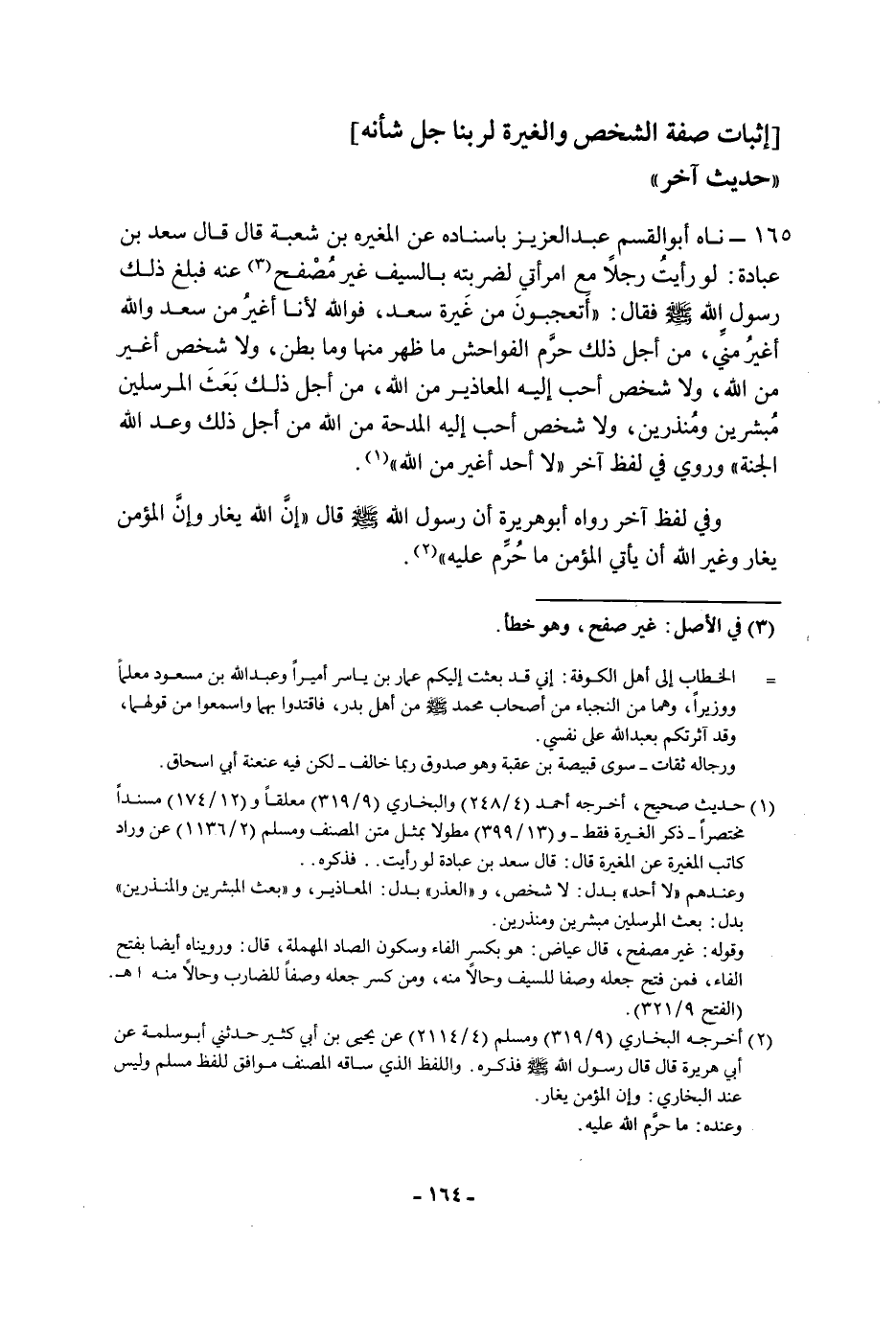 ١٦٥ - ناه أَبُو القسم عبد العزيز بإسناده، عن المغيرة بن شعبة، قَالَ: قَالَ سعد بن عبادة: لو رأيت رجلا مع امرأتي لضربته بالسيف غير مصفح عنه، فبلغ ذَلِكَ رسول الله، صَلَّى اللَّهُ عَلَيْهِ وَسَلَّمَ، فقال: " أتعجبون من غيرة سعد، فوالله لأنا أغير من سعد والله أغير مني، من أجل ذَلِكَ حرم الفواحش ما ظهر منها وما بطن، ولا شخص أغير من الله، ولا شخص أحب إليه المعاذير من الله، من أجل ذَلِكَ بعث المرسلين مبشرين ومنذرين، ولا شخص أحب إليه المدحة من الله من أجل ذَلِكَ، وعد الله الجنة " وروي فِي لفظ آخر: " لا أحد أغير من الله " وفي لفظ آخر رواه أَبُو هُرَيْرَةَ، أن رسول الله، صَلَّى اللَّهُ عَلَيْهِ وَسَلَّمَ، قَالَ: " إن الله يغار وإن المؤمن يغار، وغير الله أن يأتي المؤمن ما حرم عليه "
