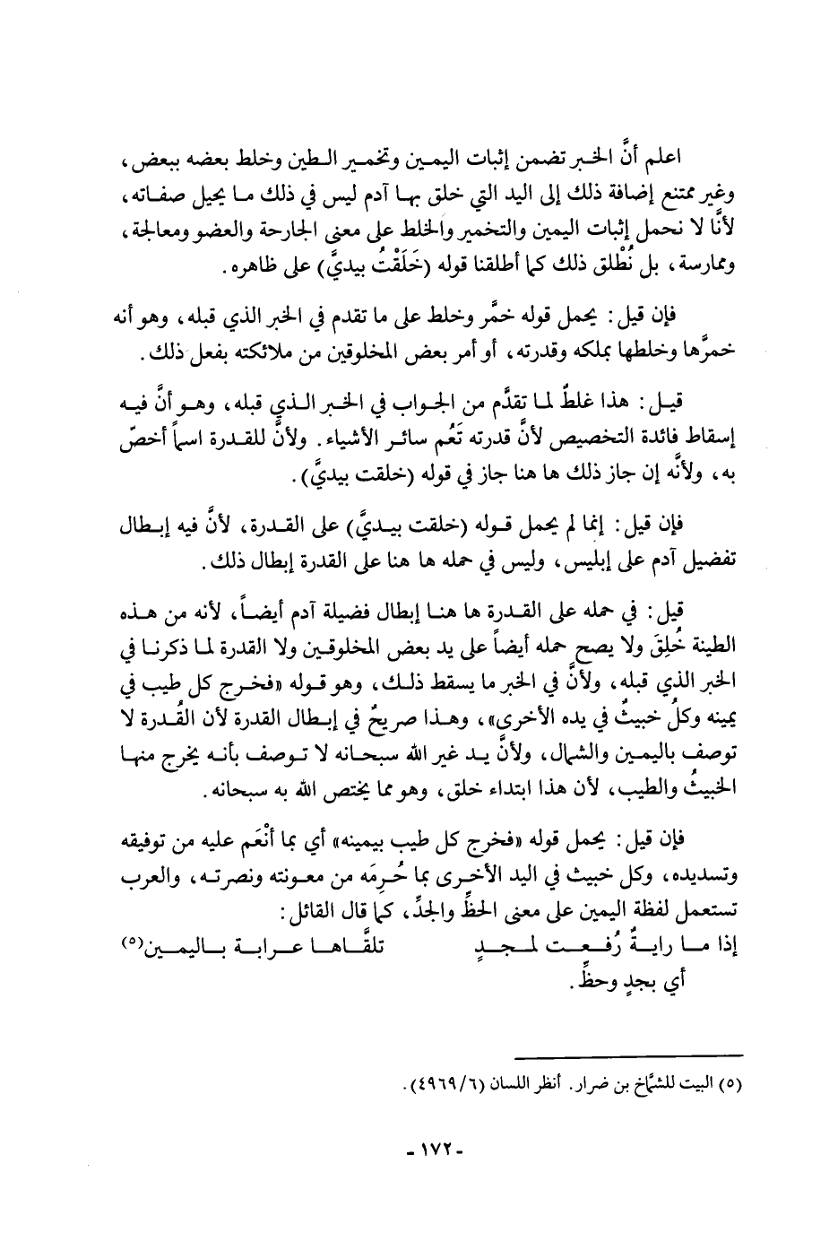 لما تقدم من الجواب فِي الخبر الذي قبله، وهو أن فيه إسقاط فائدة التخصيص لأن قدرته تعم سائر الأشياء ولأن للقدرة اسما أخص به، ولأنه إن جاز ذَلِكَ هاهنا جاز فِي قوله: خلقت بيدي فإن قيل: إنما لم يحمل قوله: خلقت بيدي عَلَى القدرة، لأن فيه إبطال تفضيل آدم عَلَى إبليس، وليس فِي حمله هاهنا عَلَى القدرة إبطال ذَلِكَ قيل: فِي حمله عَلَى القدرة هاهنا إبطال فضيلة آدم أيضا، لأنه من هَذِهِ الطينة خلق، ولا يصح حمله أيضا عَلَى يد بعض المخلوقين ولا القدرة لما ذكرنا فِي الخبر الذي قبله، ولأن فِي الخبر ما يسقط ذَلِكَ، وهو قوله: " فخرج كل طيب فِي يمينه وكل خبيث فِي يده الأخرى "، وهذا صريح فِي إبطال القدرة لأن القدرة لا توصف باليمين والشمال، ولأن يد غير الله سُبْحَانَهُ لا توصف بأنه يخرج منها الخبيث والطيب، لأن هَذَا ابتداء خلق، وهو ما يختص الله به سُبْحَانَهُ فإن قيل: يحمل قوله: " فخرج كل طيب بيمينه " أي: بما أنعم عليه من توفيقه وتسديده، وكل خبيث فِي اليد الأخرى بما حرمه من معونته ونصرته، والعرب تستعمل لفظة اليمين عَلَى معنى الحظ والجد كما قَالَ القائل: