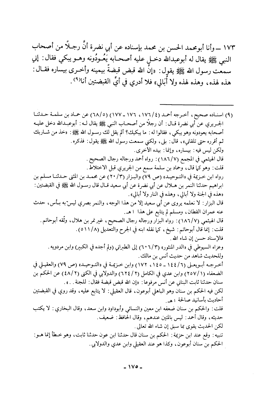 ١٧٣ - وأنا أَبُو مُحَمَّد الحسن بن مُحَمَّد بإسناده، عن أَبِي نضرة، أن رجلا من أصحاب النبي، صَلَّى اللَّهُ عَلَيْهِ وَسَلَّمَ، يقال له أَبُو عبد الله دخل عليه أصحابه يعودونه وهو يبكي، فقال: إني سمعت رسول الله، صَلَّى اللَّهُ عَلَيْهِ وَسَلَّمَ، يَقُول: " إن الله قبض قبضة بيمينه وأخرى بيساره فقال: هَذِهِ لهذه، وهذه لهذه ولا أبالي " فلا أدري فِي أي القبضتين أنا "