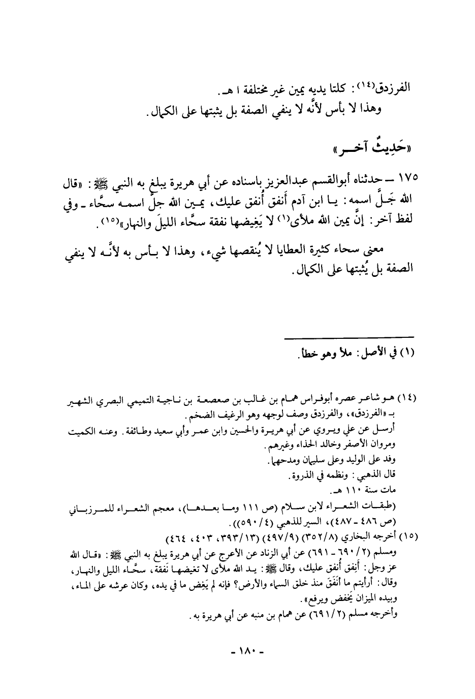 ١٧٥ - حَدَّثَنَاهُ أَبُو القسم عبد العزيز بإسناده، عن أَبِي هُرَيْرَةَ يبلغ به النبي، صَلَّى اللَّهُ عَلَيْهِ وَسَلَّمَ: " قَالَ الله جل اسمه: يابن آدم أنفق أنفق عليك، يمين الله جل اسمه سحاء - وفي لفظ آخر: إن يمين الله ملأى لا يغيضها نفقة سحاء الليل والنهار " معنى سحاء: كثيرة العطايا لا ينقصها شيء، وهذا لا بأس به لأنه لا ينفي الصفة بل يثبتها عَلَى الكمال