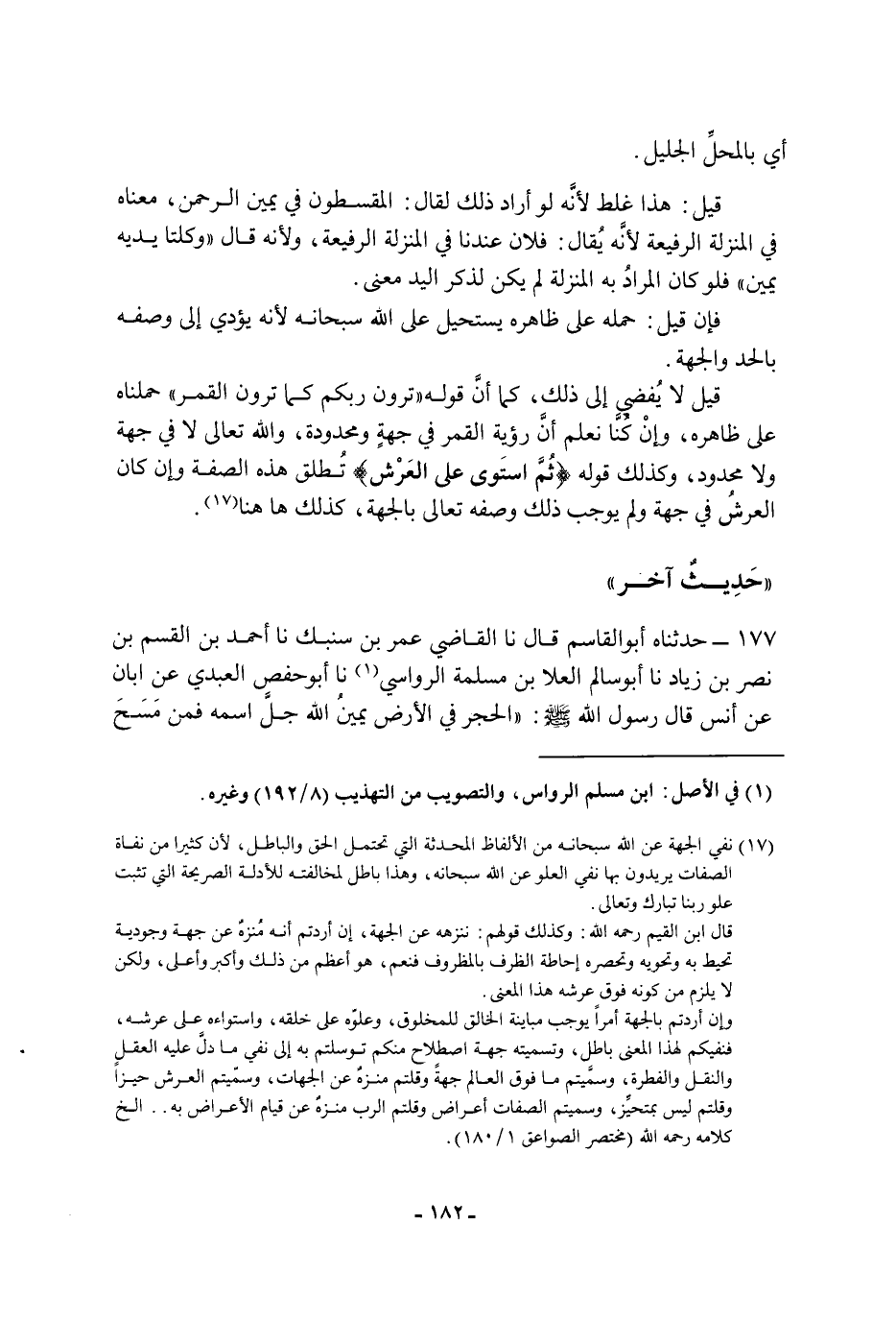 المنزلة الرفيعة لأنه يقال: فلان عندنا فِي المنزلة الرفيعة، ولأنه قَالَ: " وكلتا يديه يمين " فلو كان المراد به المنزلة لم يكن لذكر اليد معنى فإن قيل: حمله عَلَى ظاهره يستحيل عَلَى الله سُبْحَانَهُ لأنه يؤدي إلى وصفه بالحد والجهة قيل: لا يفضي إلى ذَلِكَ، كما أن قوله: " ترون ربكم كما ترون القمر " حملناه عَلَى ظاهره، وإن كنا نعلم أن رؤية القمر فِي جهة ومحدودة، والله تَعَالَى لا فِي جهة ولا محدود، وكذلك قوله: {ثُمَّ اسْتَوَى عَلَى الْعَرْشِ} تطلق هَذِهِ الصفة وإن كان العرش فِي جهة، ولم يوجب ذَلِكَ وصفه تَعَالَى بالجهة، كذلك هاهنا حديث آخر