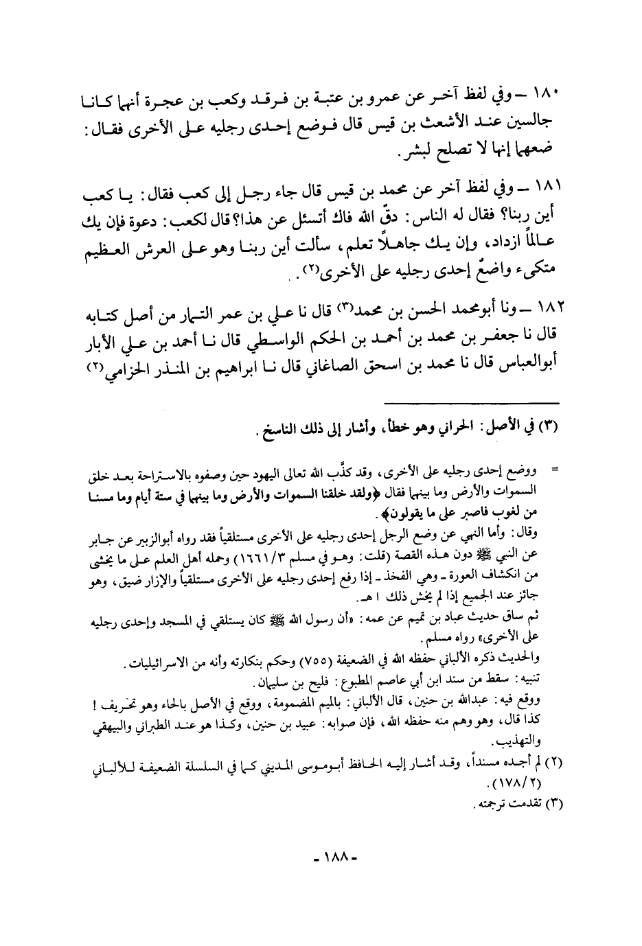 ١٨١ - وفي لفظ آخر عن مُحَمَّد بن قيس، قَالَ: جاء رجل إلى كعب فقال: يا كعب أين ربنا؟ فقال له الناس: دق الله فاك أتسأل عن هَذَا؟ قَالَ لكعب: دعوة فإن يك عالما أزداد، وإن يك جاهلا تعلم، سألت أين ربنا وهو عَلَى العرش العظيم متكئ واضع إحدى رجليه عَلَى الأخرى