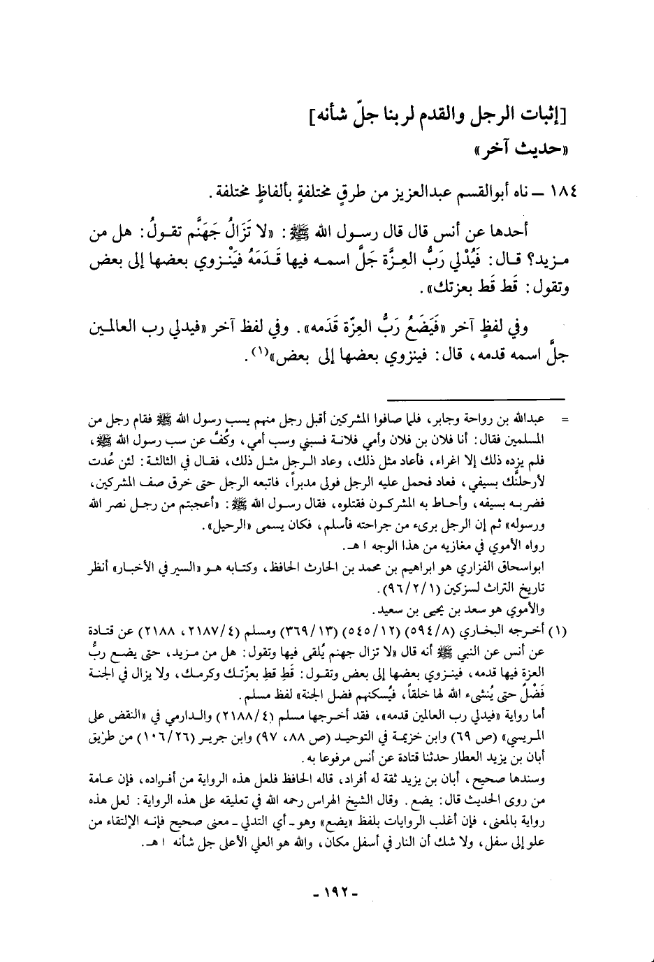 ١٨٤ - ناه أَبُو القسم عبد العزيز من طرق مختلفة بألفاظ مختلفة أحدها: عن أنس، قَالَ: قَالَ رسول الله، صَلَّى اللَّهُ عَلَيْهِ وَسَلَّمَ: " لا تزال جهنم تقول: هل من مزيد؟ قَالَ: فيدلي رب العزة جل اسمه فيها قدمه فينزوي بعضها إلى بعض، وتقول: قط قط بعزتك " وفي لفظ آخر: " يضع رب العزة قدمه " وفي لفظ آخر: " فيدلي رب العالمين جل اسمه قدمه، قَالَ: فينزوي بعضها إلى بعض "