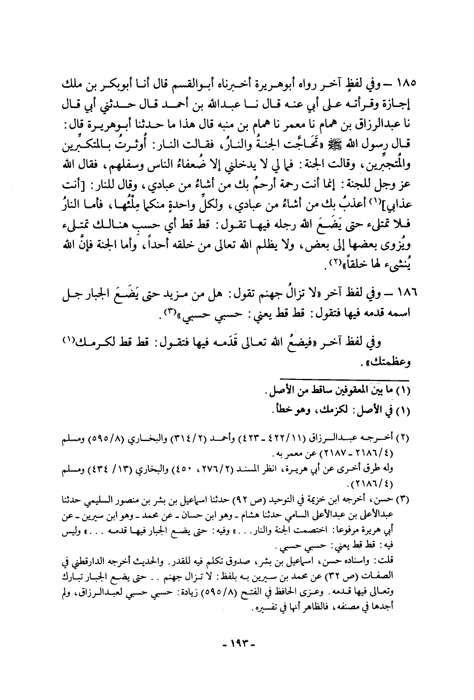 ١٨٦ - وفي لفظ آخر: " لا تزال جهنم تقول: هل من مزيد حتى يضع الجبار جل اسمه قدمه فيها فتقول: قط قط يعني: حسبي حسبي " وفي لفظ آخر: " فيضع الله تَعَالَى قدمه فيها فتقول: قط قط لكرمك وعظمتك "