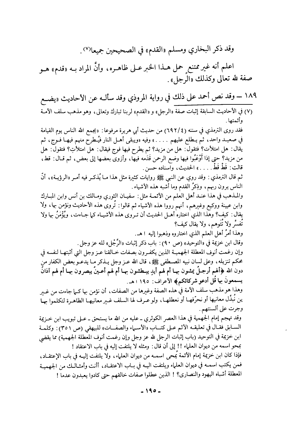 وقد ذكر البخاري ومسلم القدم فِي الصحيحين جميعا أعلم أنه غير ممتنع حمل هَذَا الخبر عَلَى ظاهره، وأن المراد به قدم هو صفة لله تَعَالَى وكذلك الرجل