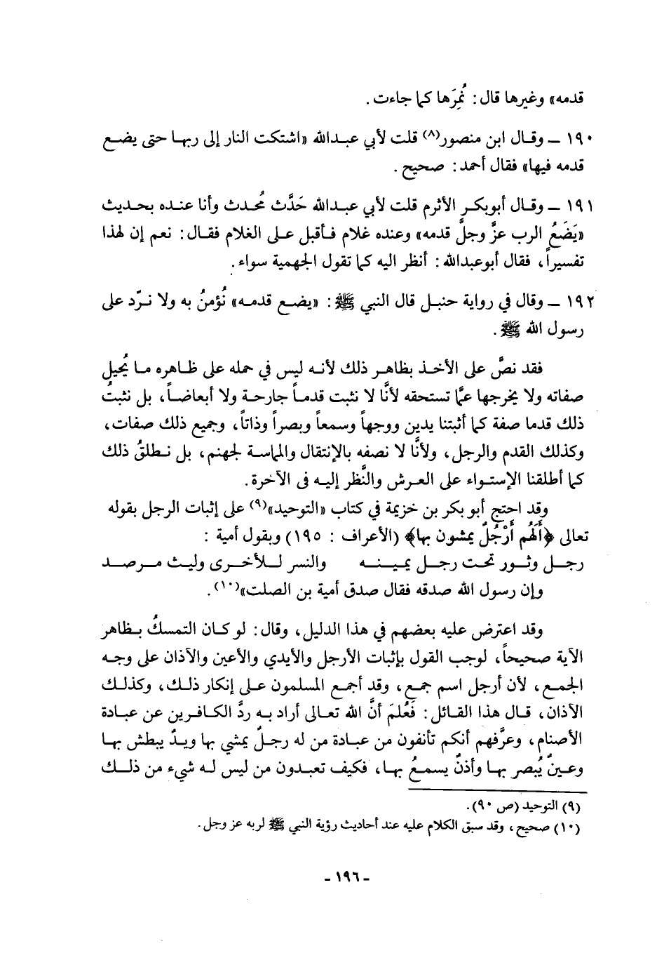 ١٩٠ - وَقَالَ ابن منصور: قلت لأبي عبد الله: " اشتكت النار إلى ربها حتى يضع قدمه فيها " فقال أَحْمَد: صحيح