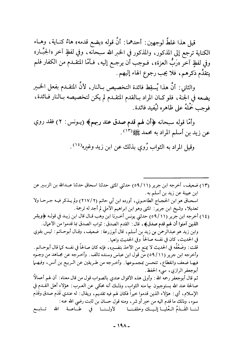أن يرجع إليه، فأما المتقدم من الكفار فلم يتقدم ذكرهم، فلا يجب رجوع الهاء إليهم والثاني: أن هَذَا يسقط فائدة التخصيص بالنار، لأن المتقدم بفعل الخير يضعه فِي الجنة، فلو كان المراد بالقدم المتقدم لم يكن لتخصيصه بالنار فائدة، فوجب حمله عَلَى ظاهره ليفيد فائدة وأما قوله سُبْحَانَهُ: {أَنَّ لَهُمْ قَدَمَ صِدْقٍ عِنْدَ رَبِّهِمْ} فقد روي عن زيد بن أسلم المراد به مُحَمَّد، صَلَّى اللَّهُ عَلَيْهِ وَسَلَّمَ وقيل: المراد به الثواب روي بذلك عن ابن زيد وغيره