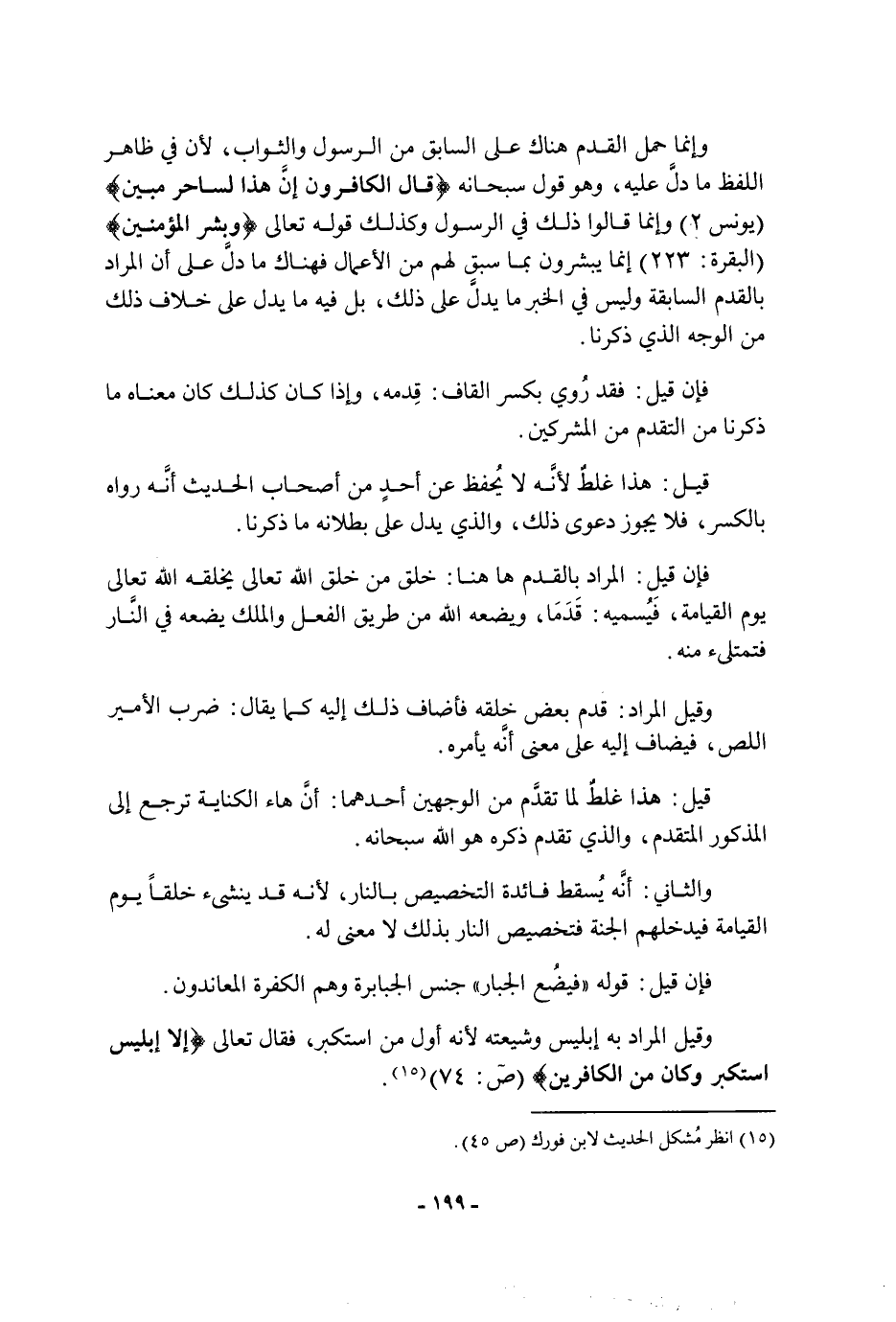 وإنما حمل القدم هناك عَلَى السابق من الرسول والثواب، لأن فِي ظاهر اللفظ ما دل عليه، وهو قول سُبْحَانَهُ: {قَالَ الْكَافِرُونَ إِنَّ هَذَا لَسَاحِرٌ مُبِينٌ} وإنما قَالُوا ذَلِكَ فِي الرسول، وكذلك قوله تَعَالَى: {وَبَشِّرِ الْمُؤْمِنِينَ} إنما يبشرون بما سبق لهم من الأعمال، فهناك ما دل عَلَى أن المراد بالقدم السابقة وليس فِي الخبر ما يدل عَلَى ذَلِكَ، بل فيه ما يدل عَلَى خلاف ذَلِكَ من الوجه الذي ذكرنا فإن قيل: فقد روي بكسر القاف: قدمه، وإذا كان كذلك كان معناه ما ذكرنا من التقدم من المشركين قيل: هَذَا غلط لأنه لا يحفظ عن أحد من أصحاب الحديث أنه رواه بالكسر، فلا يجوز دعوى ذَلِكَ، والذي يدل عَلَى بطلانه ما ذكرنا فإن قيل