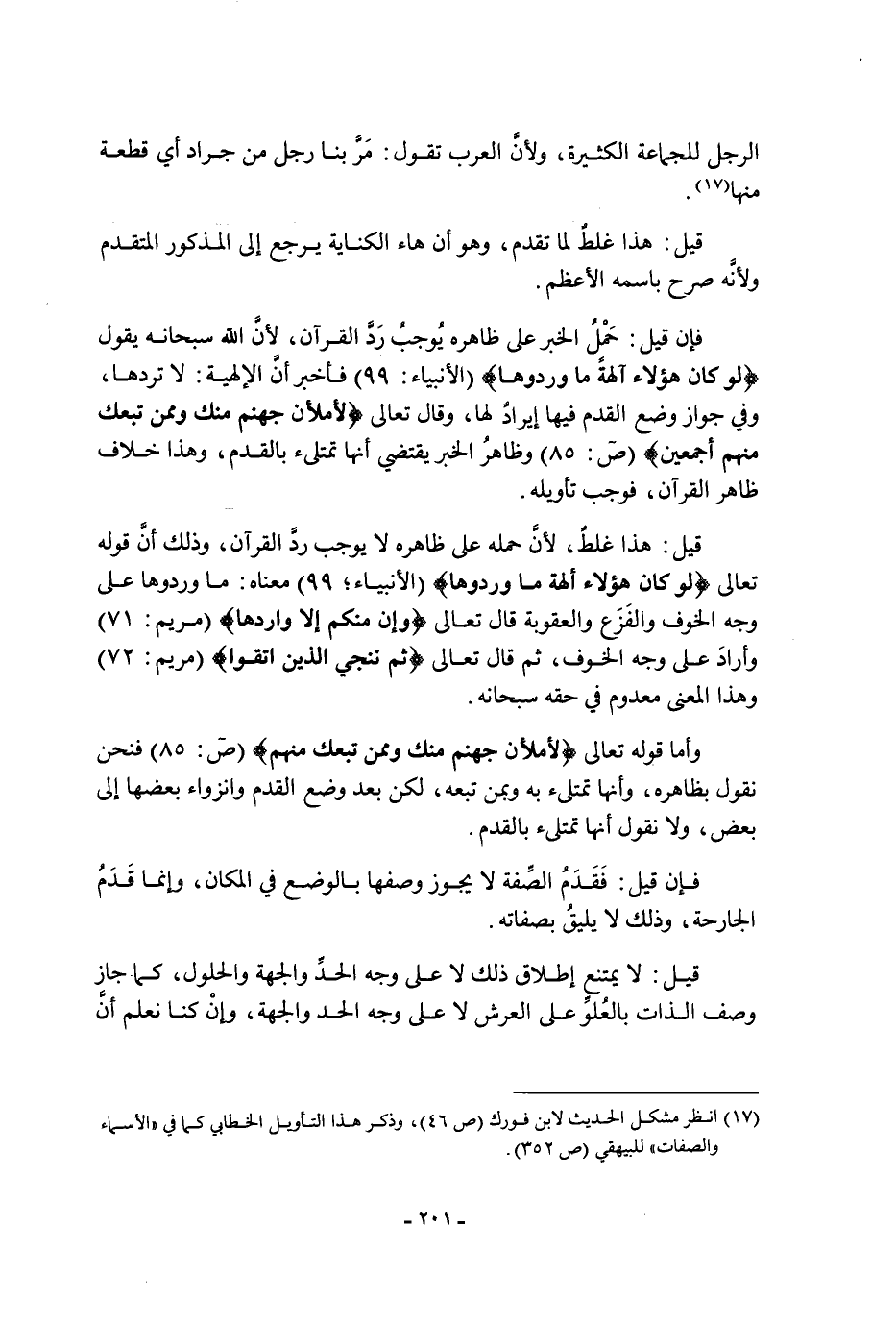 الرجل للجماعة الكثيرة، ولأن العرب تقول: مر بنا رجل من جراد أي قطعة منها قيل: هَذَا غلط لما تقدم، وهو أن هاء الكناية يرجع إلى المذكور المتقدم ولأنه صرح باسمه الأعظم فإن قيل: حمل الخبر عَلَى ظاهره يوجب رد القرآن، لأن الله سُبْحَانَهُ يَقُول: {لَوْ كَانَ هَؤُلاءِ آلِهَةً مَا وَرَدُوهَا} فأخبر أن الإلهية: لا تردها، وفي جواز وضع القدم فيها إيراد لها، وَقَالَ تَعَالَى: {لأَمْلأَنَّ جَهَنَّمَ مِنْكَ وَمِمَّنْ تَبِعَكَ مِنْهُمْ أَجْمَعِينَ} وظاهر الخبر يقتضي أنها تمتلئ بالقدم، وهذا خلاف ظاهر القرآن، فوجب تأويله قيل: هَذَا غلط، لأن حمله عَلَى ظاهره لا يوجب رد القرآن، وذلك أن قوله تَعَالَى: {لَوْ كَانَ هَؤُلاءِ آلِهَةً مَا وَرَدُوهَا} معناه: ما وردوها عَلَى وجه الخوف والفزع والعقوبة، قَالَ تَعَالَى: {وَإِنْ مِنْكُمْ إِلا وَارِدُهَا} وأراد عَلَى وجه الخوف، ثم قَالَ تَعَالَى: {ثُمَّ نُنَجِّي الَّذِينَ اتَّقَوْا} وهذا المعنى معدوم فِي حقه سُبْحَانَهُ وأما قوله تَعَالَى: {لأَمْلأَنَّ جَهَنَّمَ مِنْكَ وَمِمَّنْ تَبِعَكَ مِنْهُمْ} فنحن نقول بظاهره، وأنها تمتلئ به وبمن تبعه، لكن بعد وضع القدم وانزواء بعضها إلى بعض، ولا نقول أنها تمتلئ بالقدم فإن قيل: فقدم الصفة لا