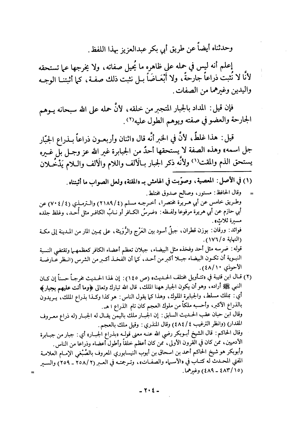 وَحُدَّثَنَاهُ أَيْضًا عَنْ طَرِيقِ أَبِي بَكْرٍ عَبْدِ الْعَزِيزِ بِهَذَا اللَّفْظِ اعلم أنه ليس فِي حمله عَلَى ظاهره ما يحيل صفاته، ولا يخرجها عما تستحقه لأنا لا نثبت ذراعا جارحة، ولا أبعاضا بل نثبت ذَلِكَ صفة، كما أثبتنا الوجه واليدين وغيرهما من الصفات فإن قيل: المداد بالجبار المتجبر من خلقه، لأن حمله عَلَى الله سُبْحَانَهُ يوهم الجارحة والعضو فِي صفته ويوهم الطول عليه قيل: هَذَا غلط، لأن فِي الخبر أنه قَالَ: " اثنان وأربعون زراعا بذراع الجبار جل اسمه "، وهذه الصفة لا يستحقها أحد من الجبابرة غير الله، عَزَّ وَجَلَّ، بل غيره يستحق الذم والمقت، ولأنه ذكر الجبار بالألف واللام والألف واللام يدخلان