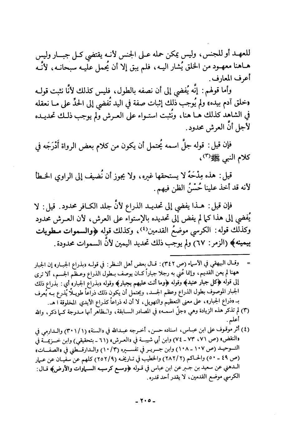 عَلَى الجنس لأنه يقتضي كل جبار وليس هاهنا معهود من الخلق يشار إليه، فلم يبق إلا أن يحمل عليه سُبْحَانَهُ، لأنه أعرف المعارف وأما قولهم: إنه يفضي إلى أن نصفه بالطول، فليس كذلك لأنا نثبت قوله: " خلق آدم بيده " ولم يوجب ذَلِكَ إثبات صفة فِي اليد تفضي إلى الحد عَلَى ما نعقله فِي الشاهد كذلك هاهنا، ونثبت استواء عَلَى العرش ولم يوجب ذَلِكَ تحديده لأجل أن العرش محدود فإن قيل: قوله جل اسمه يحتمل أن يكون من كلام بعض الرواة أدرجه فِي كلام النبي، صَلَّى اللَّهُ عَلَيْهِ وَسَلَّمَ قيل: هَذِهِ مدحه لا يستحقها غيره، ولا يجوز أن نضيف إلى الراوي الخطأ لأنه قد أخذ علينا حسن الظن فيهم فإن قيل: هَذَا يفضي إلى تحديد الذراع لأن جلد الكافر محدود قيل: لا يفضي إلى هَذَا كما لم يفض إلى تحديده بالإستواء عَلَى العرش، لأن العرش محدود وكذلك قوله: الكرسي موضع القدمين، وكذلك قوله: {وَالسَّمَوَاتُ مَطْوِيَّاتٌ بِيَمِينِهِ} ولم يوجب ذَلِكَ تحديد اليمين لأن السموات محدودة