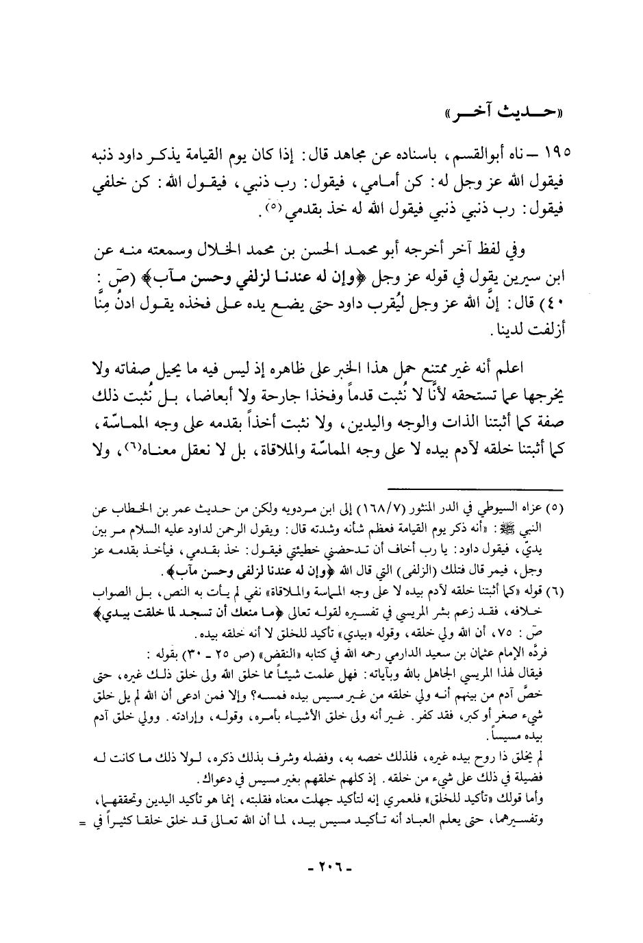 فيقول الله له: خذ بقدمي وفي لفظ آخر أخرجه أَبُو مُحَمَّد الحسن بن مُحَمَّد الخلال وسمعته منه، عن ابن سيرين، يَقُول فِي قوله، عَزَّ وَجَلَّ: {وَإِنَّ لَهُ عِنْدَنَا لَزُلْفَى وَحُسْنَ مَآبٍ} ، قَالَ: إن الله، عَزَّ وَجَلَّ، ليقرب داود حتى يضع يده عَلَى فخذه يَقُول: أدن منا أزلفت لدينا أعلم أنه غير ممتنع حمل هَذَا الخبر عَلَى ظاهره إذ ليس فيه ما يحيل صفاته ولا يخرجها عما تستحقه لأنا لا نثبت قدما وفخذا جارحة ولا أبعاضا، بل نثبت ذَلِكَ صفة كما أثبتنا الذات والوجه واليدين، ولا نثبت أخذا بقدمه عَلَى وجه المماسة، كما أثبتنا خلقه لآدم بيده لا عَلَى وجه المماسة والملاقاة، بل لا نعقل معناه، ولا