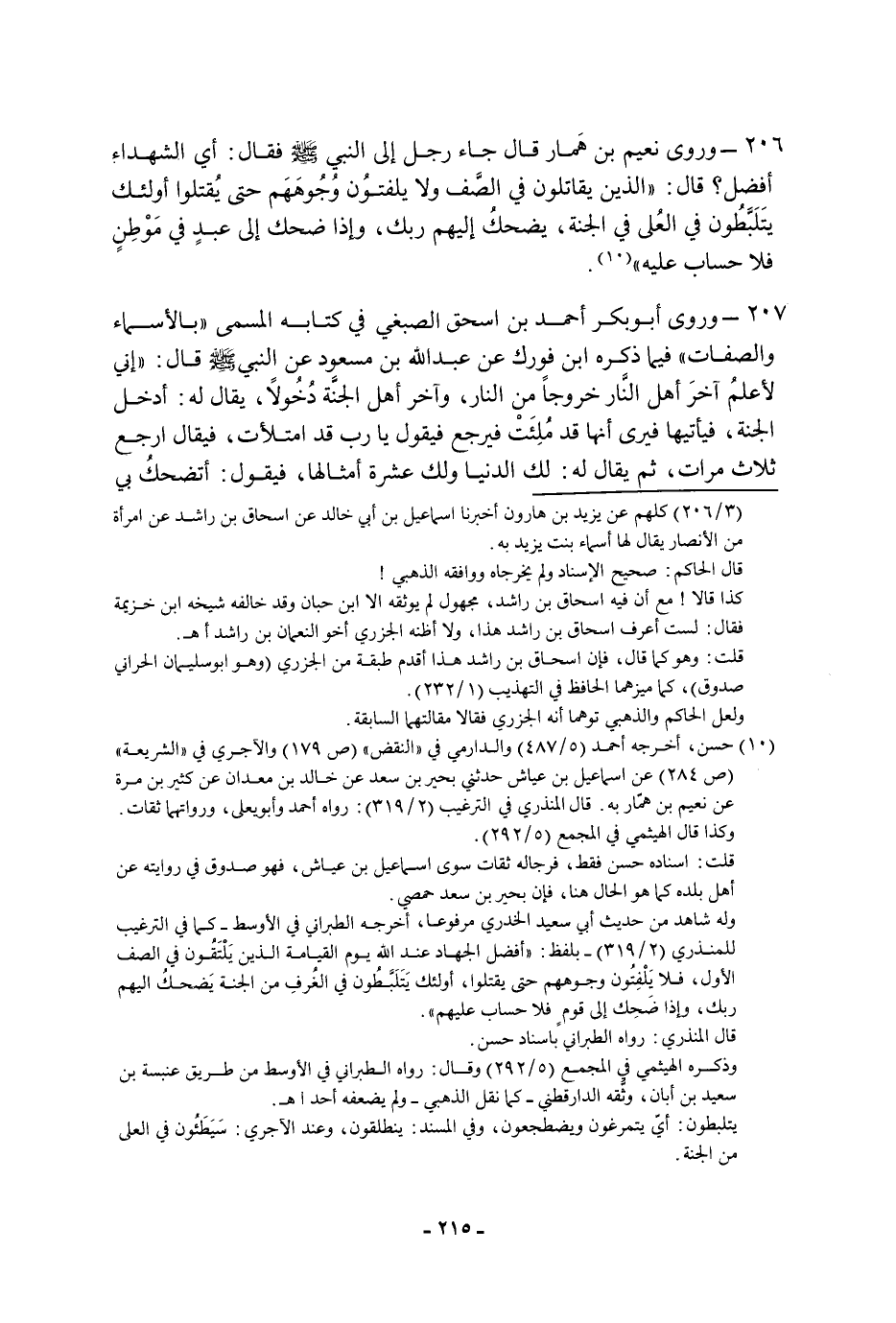 ٢٠٦ - وروى نعيم بن همار، قَالَ: جاء رجل إلى النبي، صَلَّى اللَّهُ عَلَيْهِ وَسَلَّمَ، فقال: أي الشهداء أفضل؟ قَالَ: الذين يقاتلون فِي الصف ولا يلفتون وجوههم حتى يقتلوا أولئك يتلبطون فِي العلى فِي الجنة، يضحك إليهم ربك، وإذا ضحك إلى عبد فِي موطن فلا حساب عليه "