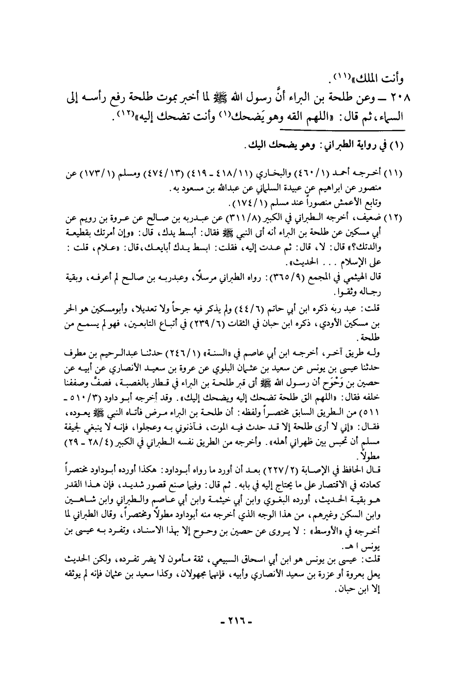 ٢٠٨ - وعن طلحة بن البراء، أن رسول الله، صَلَّى اللَّهُ عَلَيْهِ وَسَلَّمَ، لما أخبر بموت طلحة رفع رأسه إلى السماء، ثم قَالَ: " اللهم القه وهو يضحك وأنت تضحك إليه "
