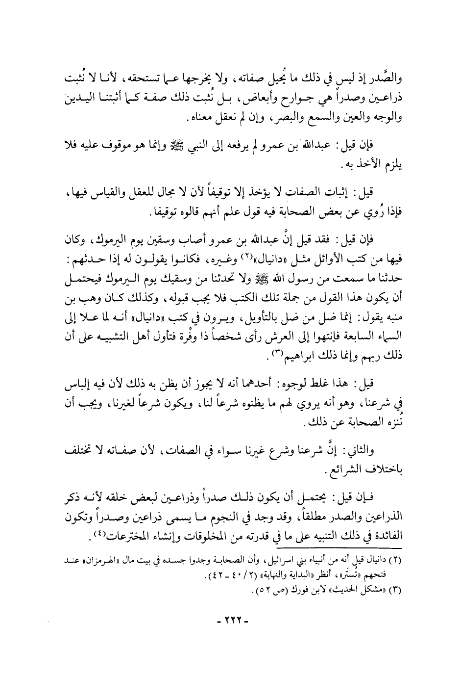 ، وإن لم نعقل معناه فإن قيل: عبد الله بن عمرو لم يرفعه إلى النبي، صَلَّى اللَّهُ عَلَيْهِ وَسَلَّمَ، وإنما هو موقوف عليه فلا يلزم الأخذ به قيل: إثبات الصفات لا يؤخذ إلا توقيفا لأن لا مجال للعقل والقياس فيها، فإذا روي عن بعض الصحابة فيه قول علم أنهم قالوه توقيفا فإن قيل: فقد قيل إن عبد الله بن عمرو وسقين يوم اليرموك، وكان فيها من كتب الأوائل مثل دانيال وغيره، فكانوا يقولون له إذا حدثهم: حَدَّثَنَا ما سمعت من رسول الله، صَلَّى اللَّهُ عَلَيْهِ وَسَلَّمَ، ولا تحدثنا من وسقيك يوم اليرموك، فيحتمل أن يكون هَذَا القول من جملة تِلْكَ الكتب فلا يجب قبوله، وكذلك كان وهب بن منبه يَقُول: إنما ضل من ضل بالتأويل، ويرون فِي كتب دانيال أنه لما علا إلى السماء السابعة فانتهوا إلى العرش رأى شخصا ذا وفرة فتأول أهل التشبيه عَلَى أن ذَلِكَ ربهم وإنما ذَلِكَ إبراهيم قيل: هَذَا غلط لوجوه: أحدهما أنه لا يجوز أن يظن به ذَلِكَ لأن فيه إلباس فِي شرعنا، وهو أنه يروي لهم ما يظنوه شرعا لنا، ويكون شرعا لغيرنا، ويجب أن ننزه الصحابة عن ذَلِكَ والثاني: إن شرعنا وشرع غيرنا سواء فِي الصفات، لأن صفاته لا تختلف باختلاف الشرائع فإن قيل: يحتمل أن يكون ذَلِكَ صدرا