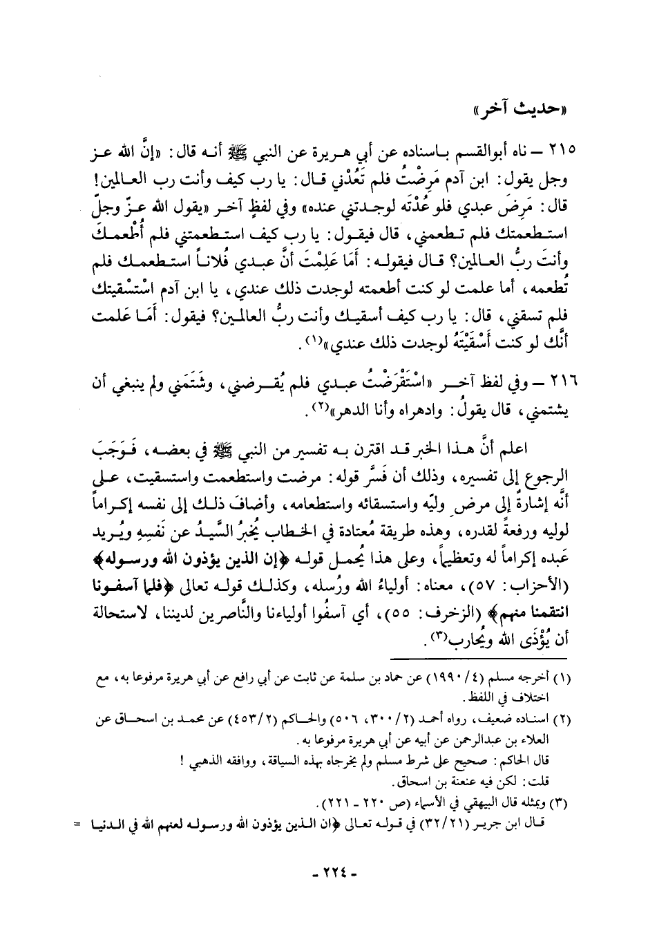 الرجوع إلى تفسيره، وذلك أن فسر قوله: مرضت واستطعمت واستسقيت، عَلَى أنه إشارة إلى مرض وليه واستسقائه واستطعامه، وأضاف ذَلِكَ إلى نفسه إكراما لوليه ورفعة لقدره، وهذه طريقة معتادة فِي الخطاب يخبر السيد عن نفسه ويريد عبده إكراما له وتعظيما، وعلى هَذَا يحمل قوله: {إِنَّ الَّذِينَ يُؤْذُونَ اللَّهَ وَرَسُولَهُ} ، معناه: أولياء الله ورسله، وكذلك قوله تَعَالَى: {فَلَمَّا آسَفُونَا انْتَقَمْنَا مِنْهُمْ} أي آسفوا أولياءنا والناصرين لديننا، لاستحالة أن يؤذي الله ويحارب