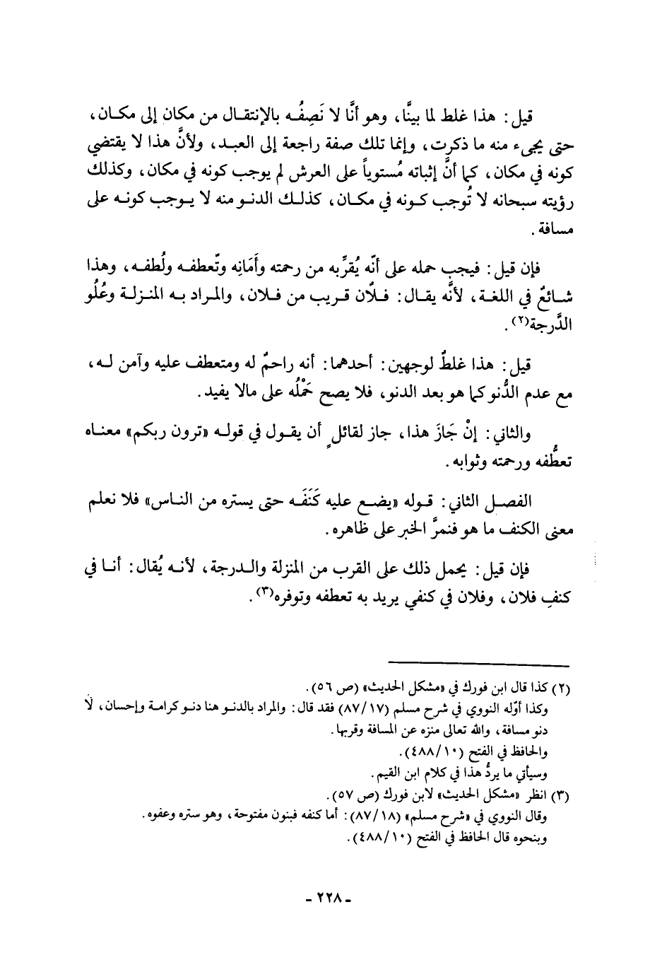 قيل: هَذَا غلط لما بينا، وهو أنا لا نصفه بالإنتقال من مكان إلى مكان، حتى يجيء منه ما ذكرت، وإنما تِلْكَ صفة راجعة إلى العبد، ولأن هَذَا لا يقتضي كونه فِي مكان، كما أن إثباته مستويا عَلَى العرش لم يوجب كونه فِي مكان، وكذلك رؤيته سُبْحَانَهُ لا توجب كونه فِي مكان، كذلك الدنو منه لا يوجب كونه عَلَى مسافة فإن قيل: فيجب حمله عَلَى أنه يقربه من رحمته وأمانه وتعطفه ولطفه، وهذا شائع فِي اللغة، لأنه يقال: فلان قريب من فلان، والمراد به المنزلة وعلو الدرجة قيل: هَذَا غلط لوجهين: أحدهما: أنه راحم له ومتعطف عليه وآمن له، مع عدم الدنو كما هو بعد الدنو، فلا يصح حمله عَلَى ما لا يفيد والثاني: إن جاز هَذَا، جاز لقائل أن يَقُول فِي قوله: " ترون ربكم " معناه تعطفه ورحمته وثوابه الفصل