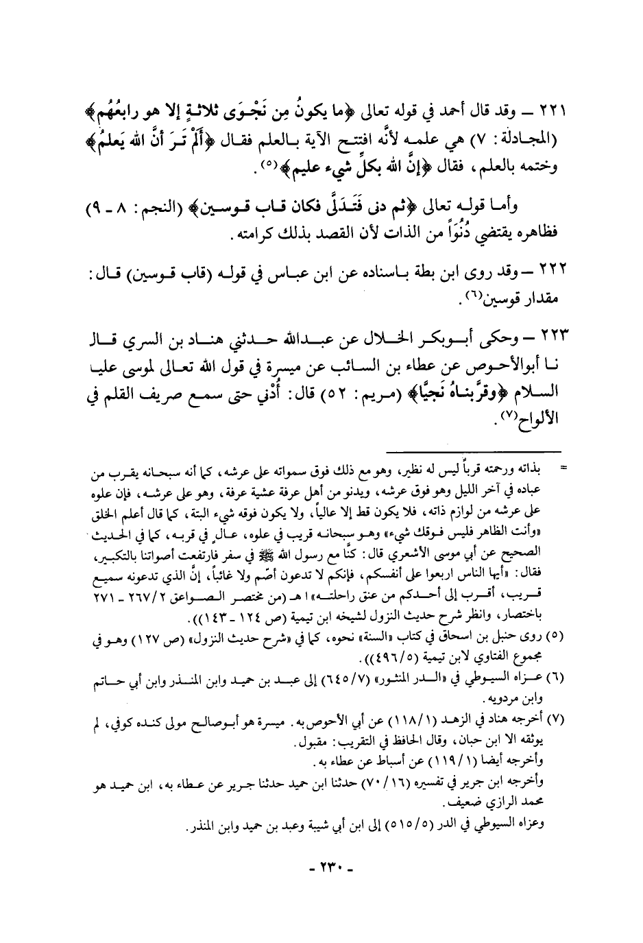 ٢٢١ - وقد قَالَ أَحْمَد فِي قوله تَعَالَى: {مَا يَكُونُ مِنْ نَجْوَى ثَلاثَةٍ إِلا هُوَ رَابِعُهُمْ} هي علمه لأنه افتتح الآية بالعلم فقال: {أَلَمْ تَرَ أَنَّ اللَّهَ يَعْلَمُ} وختمه بالعلم، فقال: {إِنَّ اللَّهَ بِكُلِّ شَيْءٍ عَلِيمٌ} وأما قوله تَعَالَى: {ثُمَّ دَنَا فَتَدَلَّى فَكَانَ قَابَ قَوْسَيْنِ} فظاهره يقتضي دنوا من الذات لأن القصد بذلك كرامته