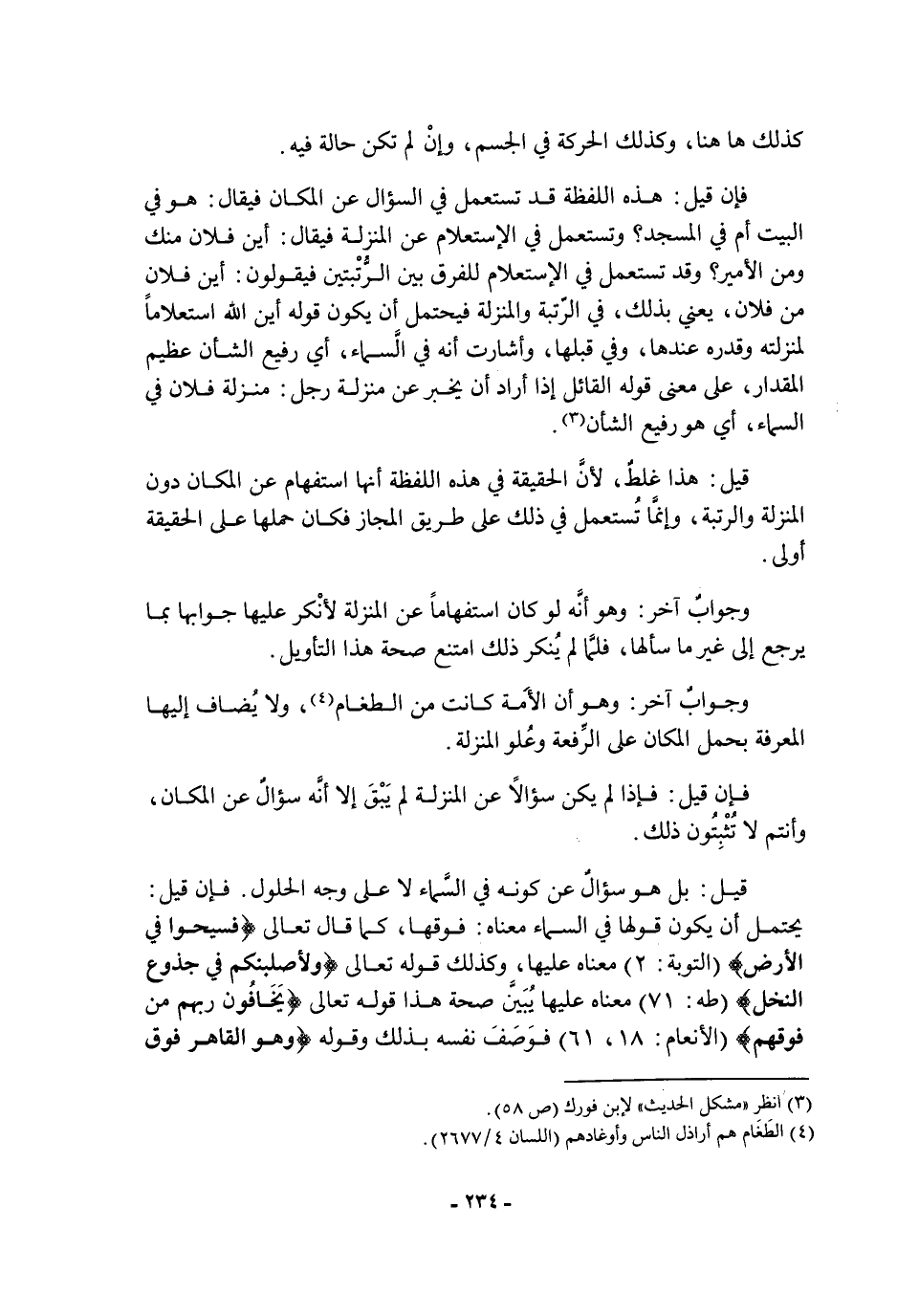 كذلك هاهنا، وكذلك الحركة فِي الجسم، وإن لم تكن حالة فيه فإن قيل: هَذِهِ اللفظة قد تستعمل فِي السؤال عن المكان فيقال: هو فِي البيت أم فِي المسجد؟ وتستعمل فِي الإستعلام عن المنزلة فيقال: أين فلان منك ومن الأمير؟ وقد تستعمل فِي الإستعلام للفرق بين الرتبتين فيقولون: أين فلان من فلان، يعني بذلك، فِي الرتبة والمنزلة فيحتمل أن يكون قوله: أين الله استعلاما لمنزلته وقدره عندها، وفي قبلها، وأشارت أنه فِي السماء، أي رفيع الشأن عظيم المقدار، عَلَى معنى قوله القائل إذا أراد أن يخبر عن