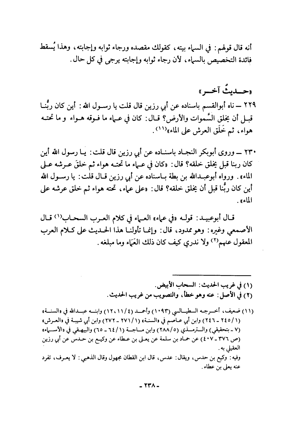 ٢٣٠ - وروى أَبُو بكر النجاد بإسناده، عن أَبِي رزين، قَالَ: قلت: يا رسول الله أين كان ربنا قبل يخلق خلقه؟ قَالَ: " كان فِي عماء ما تحته هواء ثم خلق عرشه عَلَى الماء " ورواه أَبُو عبد الله بن بطة بإسناده، عن أَبِي رزين، قَالَ: قلت: يا رسول الله أين كان ربنا قبل أن يخلق خلقه؟ قَالَ: " عَلَى عماء، تحته هواء ثم خلق عرشه عَلَى الماء " قال أَبُو عبيد
