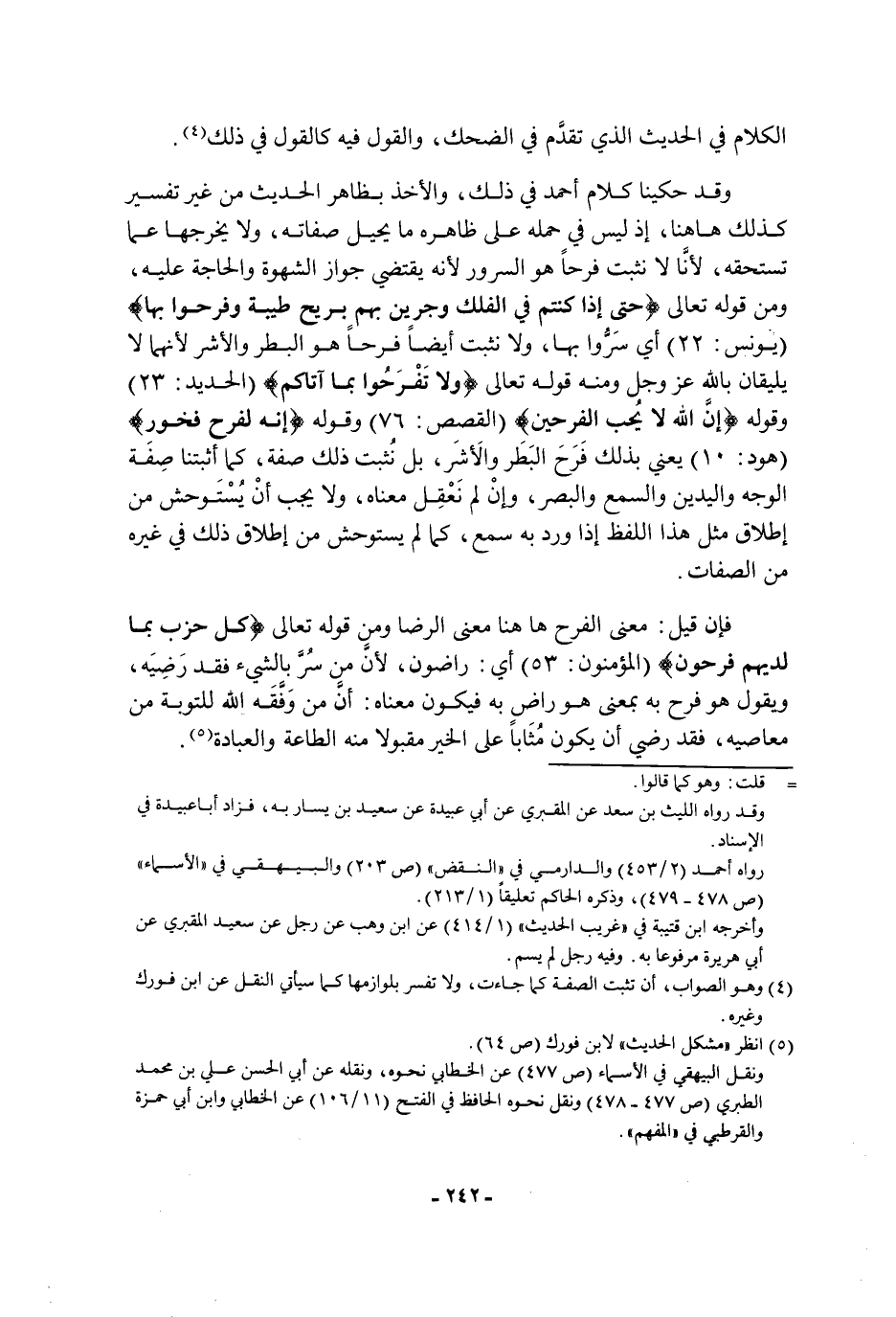 الكلام فِي الحديث الذي تقدم فِي الضحك، والقول فيه كالقول فِي ذَلِكَ وقد حكينا كلام أَحْمَد فِي ذَلِكَ، والأخذ بظاهر الحديث من غير تفسير كذلك هاهنا، إذ ليس فِي حمله عَلَى ظاهره ما يحيل صفاته، ولا يخرجها عما تستحقه، لأنا لا نثبت فرحا هو السرور لأنه يقتضي جواز الشهوة والحاجة عليه، ومن قوله تَعَالَى: {حَتَّى إِذَا كُنْتُمْ فِي الْفُلْكِ وَجَرَيْنَ بِهِمْ بِرِيحٍ طَيِّبَةٍ وَفَرِحُوا بِهَا} أي سروا بها، ولا نثبت أيضا