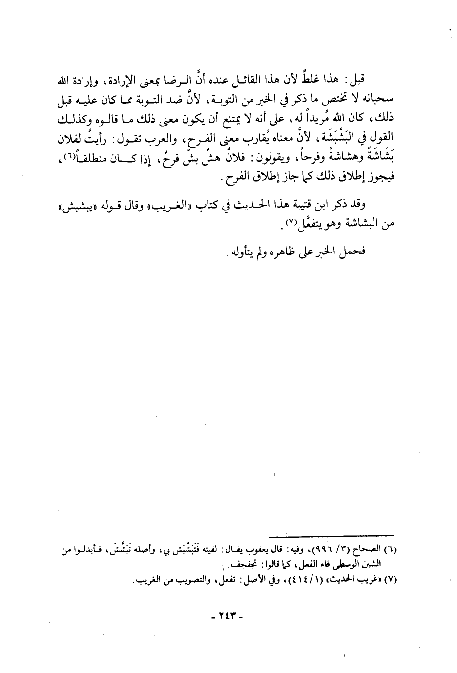 قيل: هَذَا غلط لأن هَذَا القائل عنده أن الرضا بمعنى الإرادة، وإرادة الله سُبْحَانَهُ لا تختص ما ذكر فِي الخبر من التوبة، لأن ضد التوبة مما كان عليه قبل ذَلِكَ، كان الله مريدا له، عَلَى أنه لا يمتنع أن يكون معنى ذَلِكَ ما قالوه وكذلك القول فِي البشبشة، لأن معناه يقارب معنى الفرح، والعرب تقول: رأيت لفلان بشاشة، وهشاشة