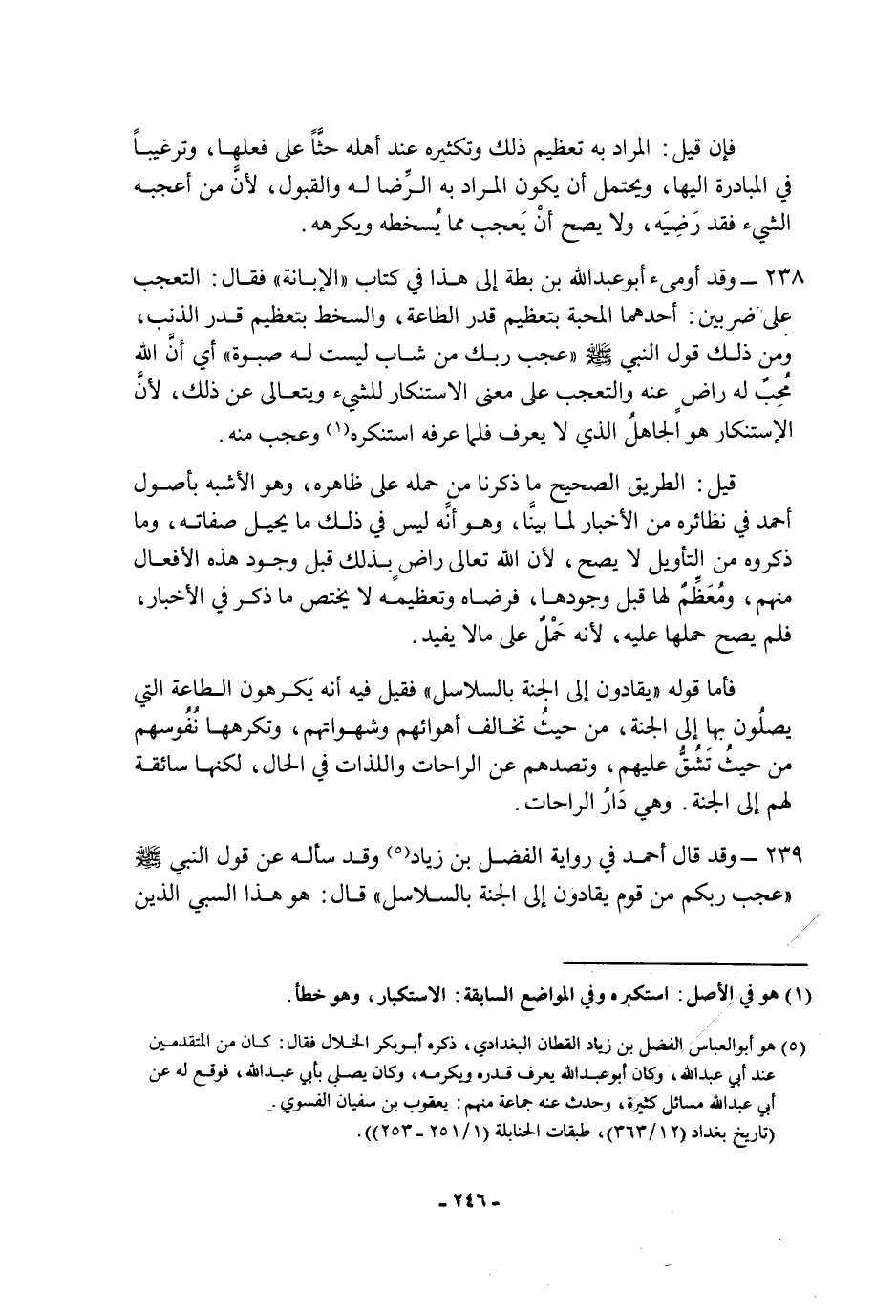 ٢٣٨ - وقد أومئ أَبُو عبد الله بن بطة إلى هَذَا فِي كتاب الإبانة، فقال: التعجب عَلَى ضربين: أحدهما المحبة بتعظيم قدر الطاعة، والسخط بتعظيم قدر الذنب، ومن ذَلِكَ قول النبي، صَلَّى اللَّهُ عَلَيْهِ وَسَلَّمَ: " عجب ربك من شاب ليست له صبوة " أي: أن الله محب له راض عنه، والتعجب عَلَى معنى الاستنكار للشيء ويتعالى عن ذَلِكَ، لأن الإستنكار هو الجاهل الذي لا يعرف فلما عرفه استنكره وعجب منه قيل: الطريق الصحيح ما ذكرناه من حمله عَلَى ظاهره، وهو الأشبه بأصول أَحْمَد فِي نظائره من الأخبار لما بينا، وهو أنه ليس فِي ذَلِكَ ما يحيل صفاته، وما ذكروه من التأويل لا يصح، لأن الله تَعَالَى راض بذلك قبل وجود هَذِهِ الأفعال منهم، ومعظم لها قبل وجودها، فرضاه وتعظيمه لا يختص ما ذكر فِي الأخبار، فلم يصح حملها عليه، لأنه حمل عَلَى ما لا يفيد فأما قوله: " يقادون إلى الجنة بالسلاسل " فقيل فيه: أنه يكرهون الطاعة التي يصلون بها إلى الجنة، من حيث تخالف أهوائهم وشهواتهم، وتكرهها نفوسهم من