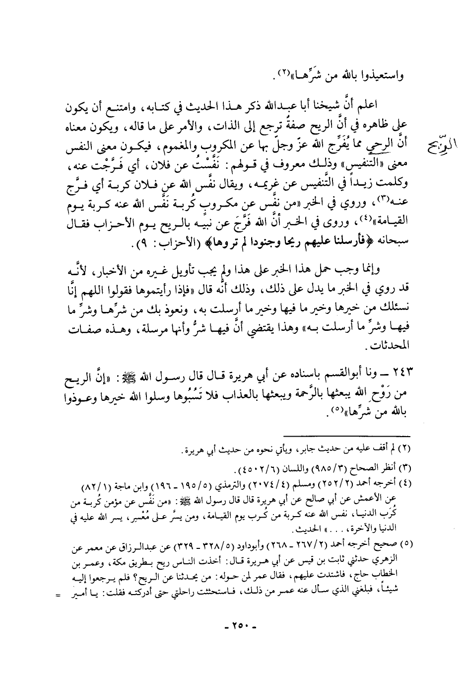 واستعيذوا بالله من شرها " أعلم أن شيخنا أَبَا عبد الله ذكر هَذَا الحديث فِي كتابه، وامتنع أن يكون عَلَى ظاهره فِي أن الريح صفة ترجع إلى الذات، والأمر عَلَى ما قاله، ويكون معناه أن الرحي مما يفرج الله، عَزَّ وَجَلَّ، بها عن المكروب والمغموم، فيكون معنى النفس معنى التنفيس، وذلك معروف فِي قولهم: نفست عن فلان، أي فرجت عنه، وكلمت زيدا فِي التنفيس عن غريمة، ويقال: نفس الله عن فلان كربة أي: فرج عنه، وروي فِي الخبر: " من نفس عن مكروب كربة نفس الله عنه كربة يوم القيامة " وروى فِي الخبر أن الله فرج عن نبيه بالريح يوم الأحزاب فقال سُبْحَانَهُ: {فَأَرْسَلْنَا عَلَيْهِمْ رِيحًا وَجُنُودًا لَمْ تَرَوْهَا} وإنما وجب حمل هَذَا الخبر عَلَى هَذَا، ولم يوجب تأويل غيره من الأخبار لأنه قد روي فِي الخبر ما يدل عَلَى ذَلِكَ، وذلك أنه قَالَ: " فإذا رأيتموها فقولوا: اللهم إنا نسألك من خيرها وخير ما فيها وخير ما أرسلت به، ونعوذ بك من شرها وشر ما فيها وشر ما