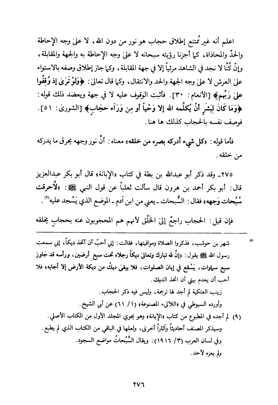 ٢٧٥ - وَقَدْ ذَكَرَ أَبُو عَبْدِ اللَّهِ بْنُ بُطَّةَ فِي كِتَابِ الإِبَانَةِ، قَالَ أَبُو بَكْرٍ عَبْدُ الْعَزِيزِ، قَالَ: أَبُو بَكْرٍ أَحْمَدُ بْنُ هَارُونَ، قَالَ: سَأَلْتُ ثَعْلَبًا عَنْ قَوْلِ النَّبِيِّ صَلَّى اللَّهُ عَلَيْهِ وَسَلَّمَ: " لأَحَرْقَتْ سُبُحَاتُ وَجْهِهِ " فَقَالَ: السُّبُحَاتُ - يَعْنِي مِنَ ابْنِ آدَمَ - الْمَوْضِعَ الَّذِي يَسْجُدُ عَلَيْهِ فَإِنْ قِيلَ: الْحِجَابُ رَاجِعٌ إِلَى الْخَلْقِ لأَنَّهُمْ هُمُ الْمَحْجُوبُونَ عَنْهُ بِحِجَابٍ يَخْلُقُهُ