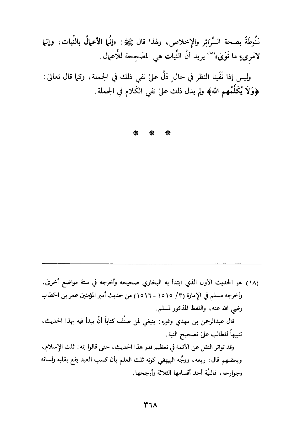 منوطة بصحة السرائر والإخلاص، ولهذا قَالَ صَلَّى اللَّهُ عَلَيْهِ وَسَلَّمَ: " إنما بالنيات، وإنما لا مرئ مَا نوى " يريد أن النيات هِيَ المصححة للأعمال وليس إِذَا نفينا النظر فِي حال دل عَلَى نفي ذلك فِي الجملة، وَكَمَا قَالَ تَعَالَى: {وَلا يُكَلِّمُهُمُ اللَّهُ} ولم يدل ذلك عَلَى نفي الكلام فِي الجملة