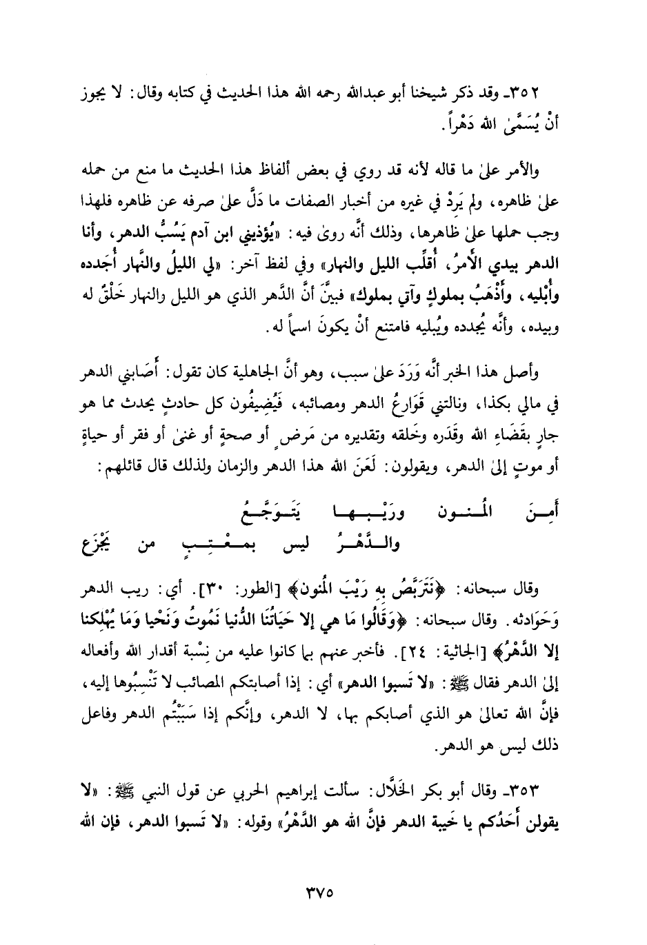 ٣٥٢ - وَقَدْ ذَكَرَ شيخنا أَبُو عبد اللَّه رحمه اللَّه هَذَا الحديث فِي كتابه وَقَالَ: لا يجوز أن يسمى اللَّه دهرا والأمر عَلَى مَا قاله لأَنَّهُ قد روي فِي بعض ألفاظ هَذَا الحديث مَا منع من حمله عَلَى ظاهره، ولم يرد فِي غيره من أخبار الصفات مَا دل عَلَى صرفه عَن ظاهره فلهذا وجب حملها عَلَى ظاهرها، وذلك أَنَّهُ رَوَى فِيهِ: " يؤذيني ابن آدم يسب الدهر، وأنا الدهر بيدي الأمر، أقلب الليل والنهار " وَفِي لفظ آخر: " لي الليل والنهار أجدده وأبليه، وأذهب بملوك وآتي بملوك " فبين أن الدهر الَّذِي هُوَ الليل والنهار خلق لَهُ وبيده، وأنه يجدده ويبليه فامتنع أَنْ يَكُونَ اسما لَهُ وأصل هَذَا الخبر أَنَّهُ ورد عَلَى سبب، وَهُوَ أن الجاهلية كان تقول: أصابني الدهر فِي مالي بكذا، ونالتني قوارع الدهر ومصائبه، فيضيفون كل حادث يحدث مما هُوَ جار بقضاء اللَّه وقدره