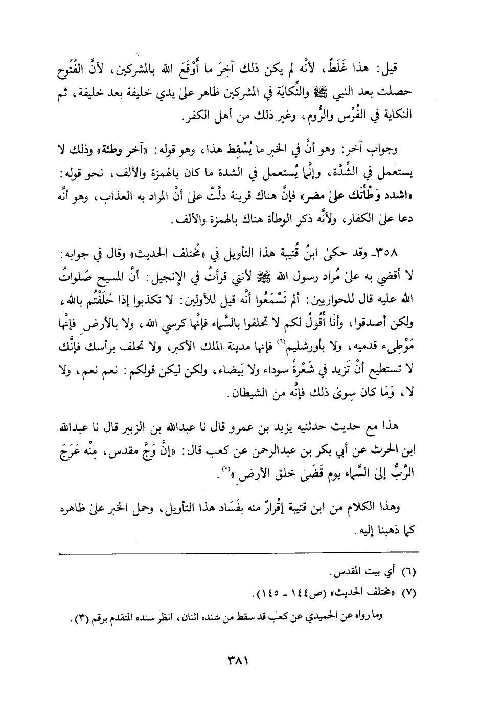 : نعم نعم، وَلا لا، وما كان سوى ذلك فإنه من الشيطان هذا مع حديث حدثنيه يزيد بْن عمرو قَالَ: نا عبد اللَّه بْن الزبير، قَالَ: نا عبد اللَّه بْن الحرث، عَن أَبِي بكر بْن عبد الرَّحْمَنِ، عَن كعب قَالَ: " إن وج مقدس، مِنْهُ عرج الرب إِلَى السماء يوم قضى خلق الأرض " وهذا الكلام من ابن قتيبة إقرار مِنْهُ بفساد هَذَا التأويل، وحمل الخبر عَلَى ظاهره كَمَا ذهبنا إِلَيْهِ