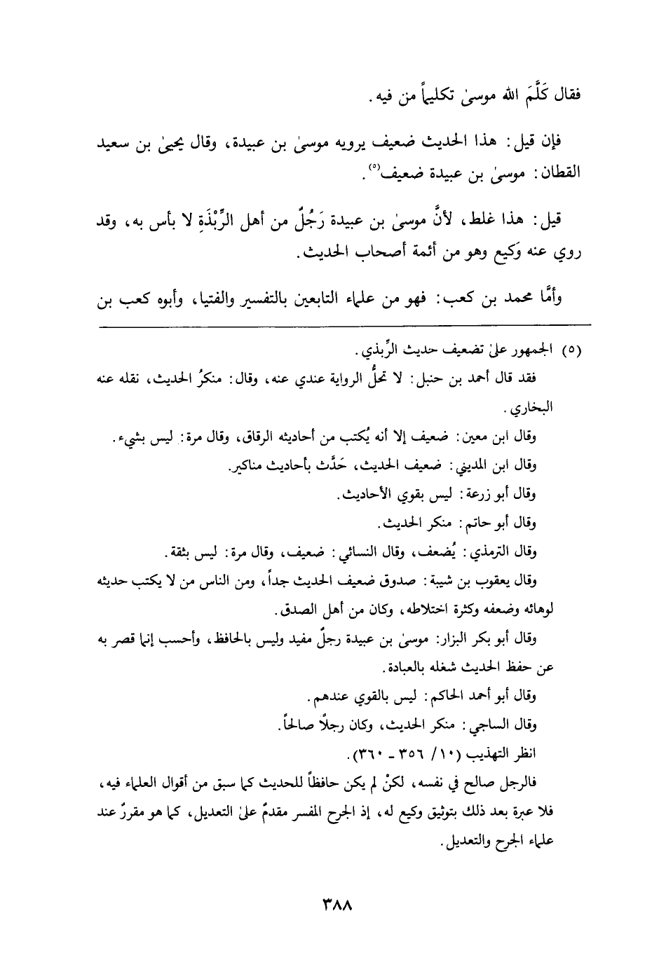 فَقَالَ: كلم اللَّه مُوسَى تكليما من فِيهِ فإن قِيلَ: هَذَا الحديث ضعيف يرويه مُوسَى بْن عبيدة، وَقَالَ يَحْيَى بْن سعيد القطان: مُوسَى بْن عبيدة ضعيف قيل: هَذَا غلط، لأَنَّ مُوسَى بْن عبيدة رجل من أهل الربذة لا بأس به، وقد روي عَنْهُ وكيع وَهُوَ من أئمة أصحاب الحديث وأما محمد بْن كعب: فهو